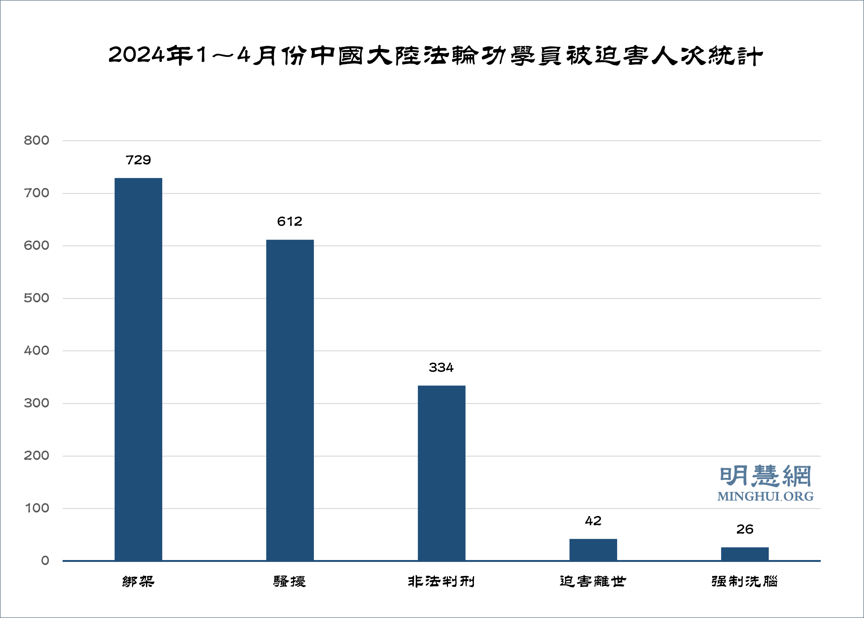 据明慧网报道统计,二零二四年三、四月份获知至少又有1031名法轮功学员被非法绑架、骚扰。