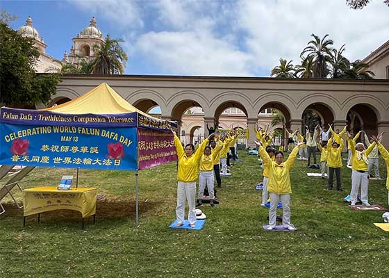 五月十一日,美国加州圣地亚哥法轮功学员在当地著名景点巴博亚公园举行集体炼功和讲真相活动,庆祝第二十五届世界法轮大法日。