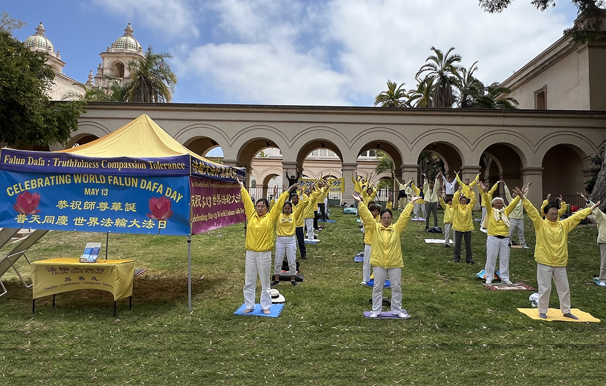 【明慧网二零二四年五月十二日】二零二四年五月十一日,美国加州圣地亚哥法轮功学员在当地著名景点巴博亚公园举行集体炼功和讲真相活动,庆祝第二十五届世界法轮大法日,法轮大法弘传世界三十二周年,并恭贺李洪志师尊华诞。
