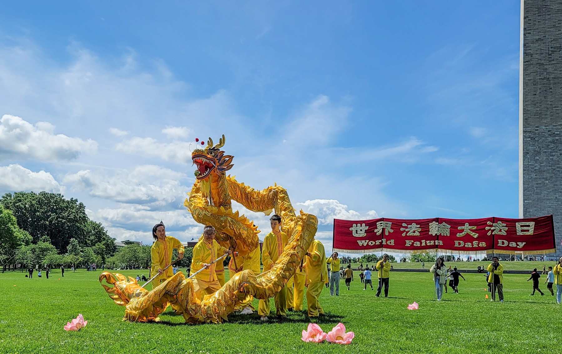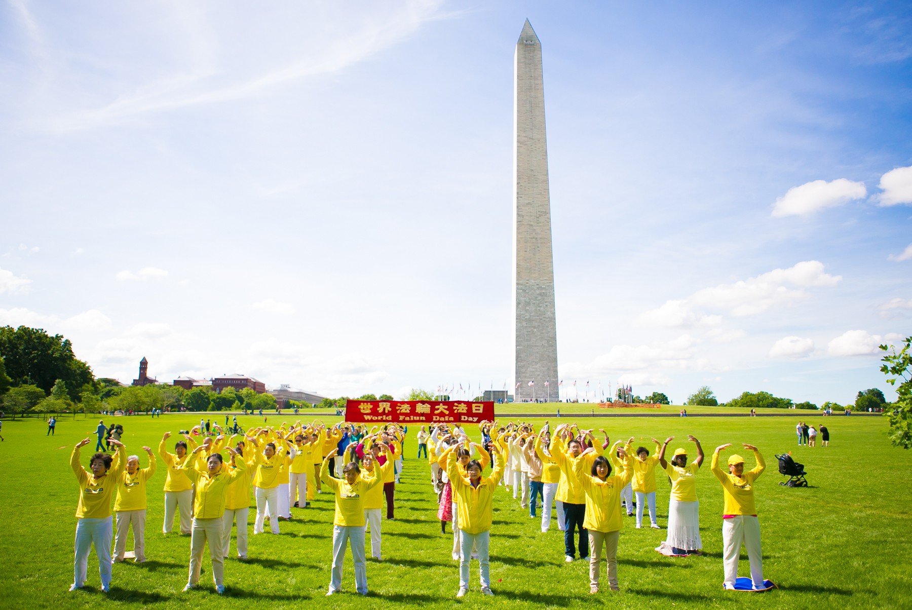 星期六上午,大华府地区不同族裔的法轮功学员在华盛顿纪念碑附近的国家广场大草坪上集体炼功,随后以舞龙、腰鼓、舞蹈等表演庆祝“世界法轮大法日”。