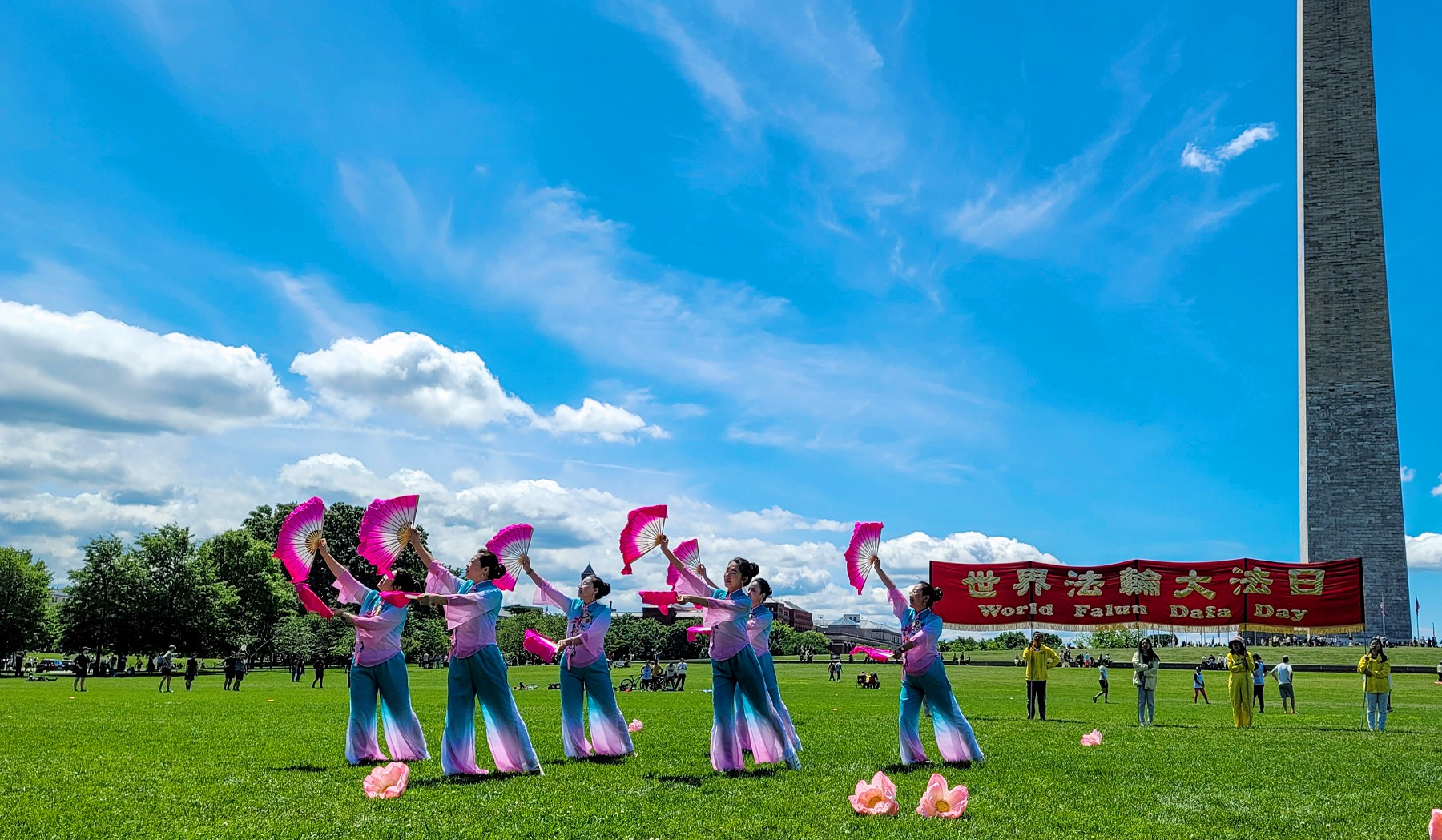 图1:二零二四年五月十一日,美国首都华盛顿的部分法轮功学员在美国国家广场庆祝“世界法轮大法日”,恭祝师父生日快乐。