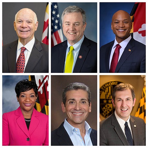图7:大华府的各级政要为“法轮大法日”颁发特别褒奖。上排左起:美国参议院外交关系委员会主席,来自马里兰州的民主党联邦参议员本·卡丁(Ben Cardin),马里兰州联邦众议员大卫·特罗恩(David Trone),美国马里兰州州长韦斯·摩尔(Wes Moore)。下排左起:马里兰州众议院议长艾德丽安·钟斯(Adrienne A. Jones),马里兰州参议员本杰明·克雷默(Benjamin F. Kramer),马里兰州巴尔的摩郡郡长小约翰·奥尔泽沃斯基(John A. Olszewski,Jr.)。