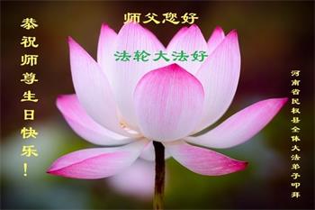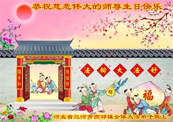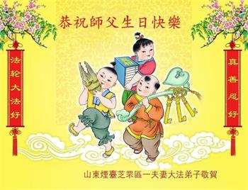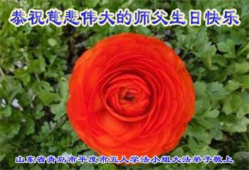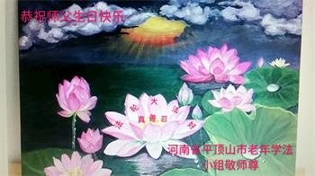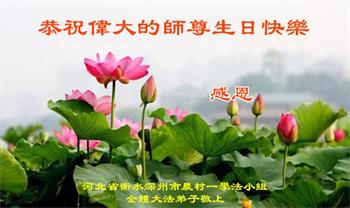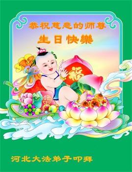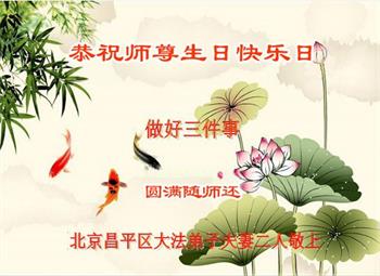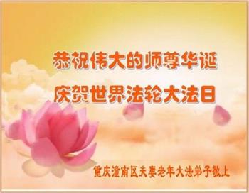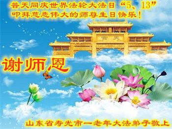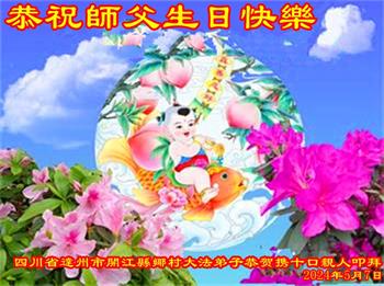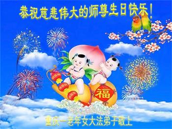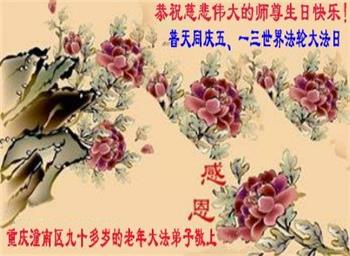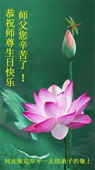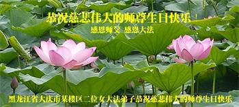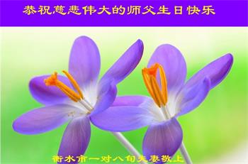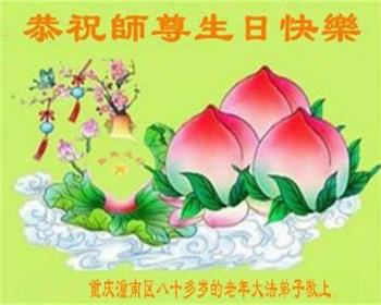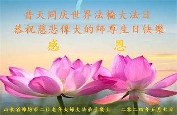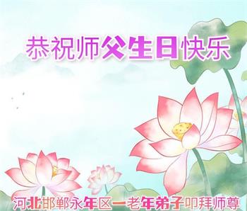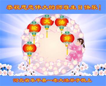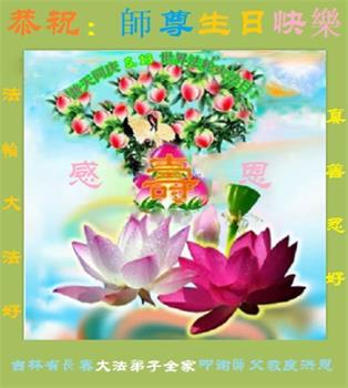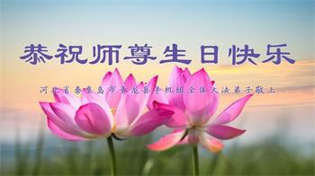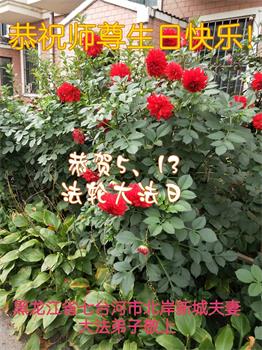 老伴也天天诚念“法轮大法好 真善忍好”,得了福报。老伴80岁了,不但身体硬朗还能下地干农活,不用子女操心,了解我们的人都知道是法轮功救了我的命。师父的救命之恩弟子永远不忘,祝恩师生日快乐!