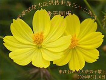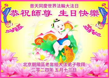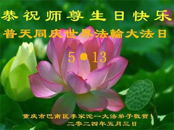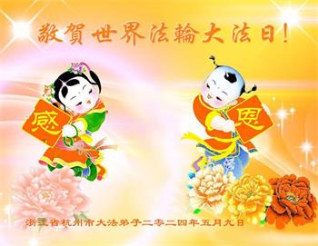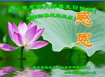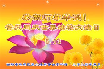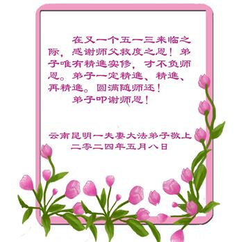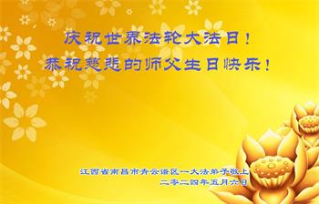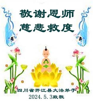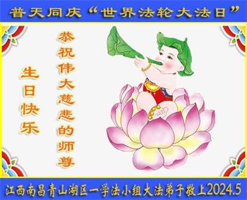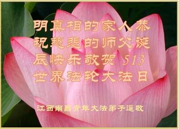 江西省南昌市西湖区一新学员问候师父:“师父好!前年我不幸患上晚期癌症且已转移到头部,昏迷,被送医院救治,生命垂危。二零二三年夏季,我有幸得法修炼,通过学法炼功,我真切感受到了师父为我清理调整身体。如今我不仅停掉了全部药物,而且身体状况越来越好,还能照看小外孙女。值此‘5.13’世界法轮大法日,我给师父叩首合十!感谢师父的救命之恩!”