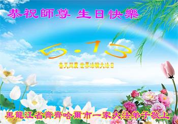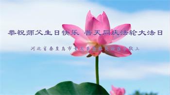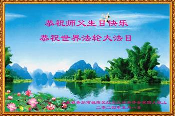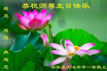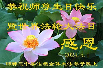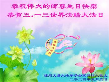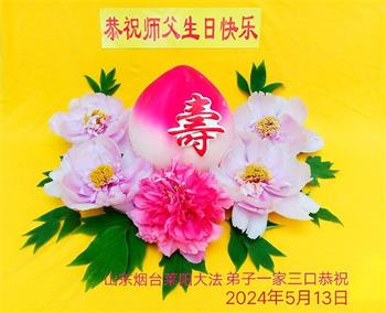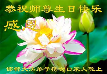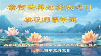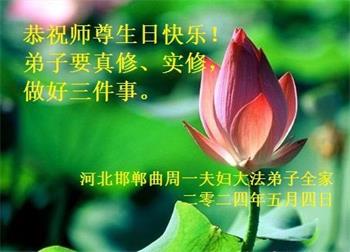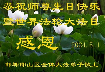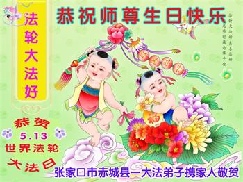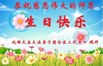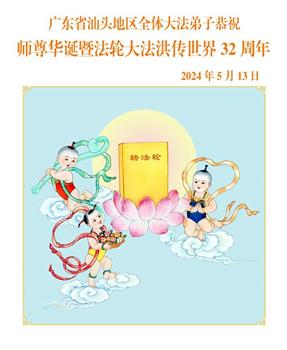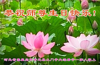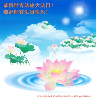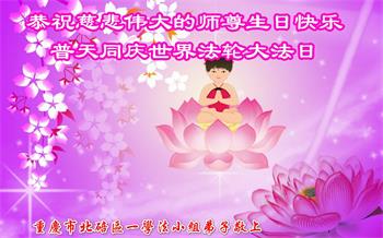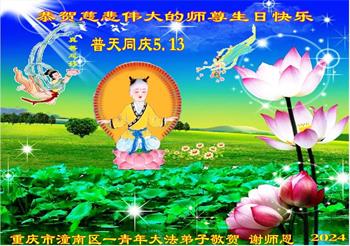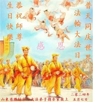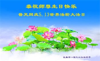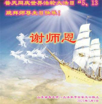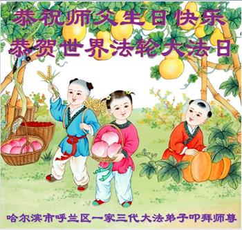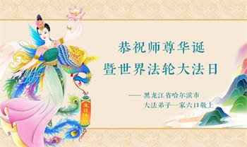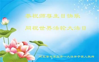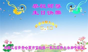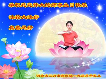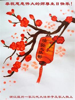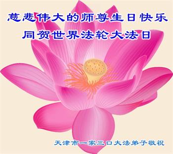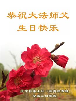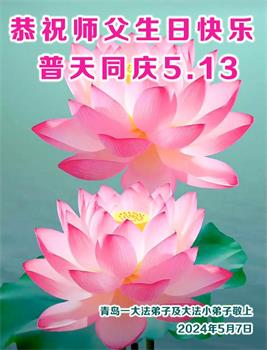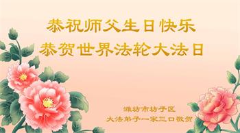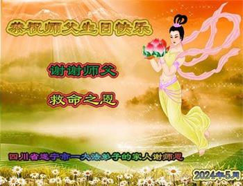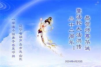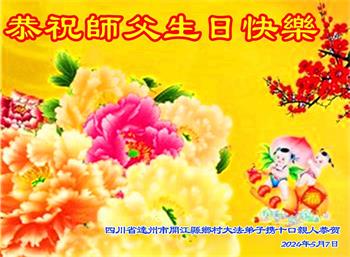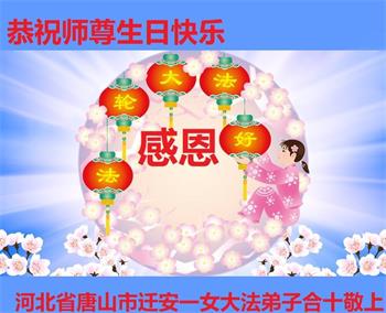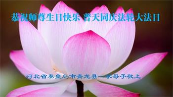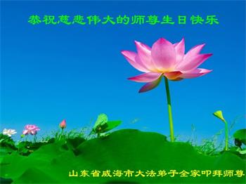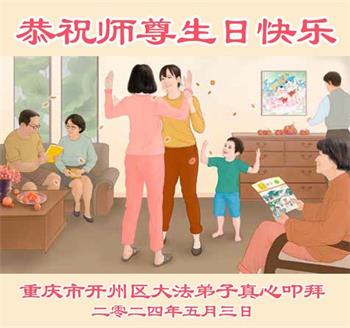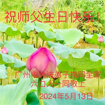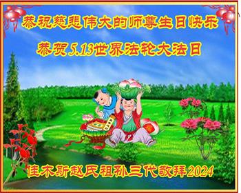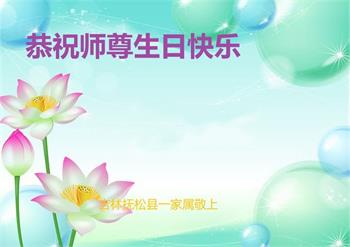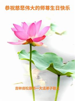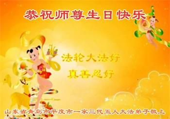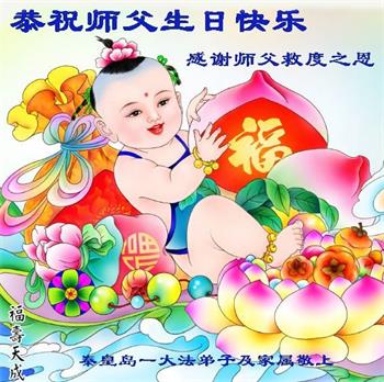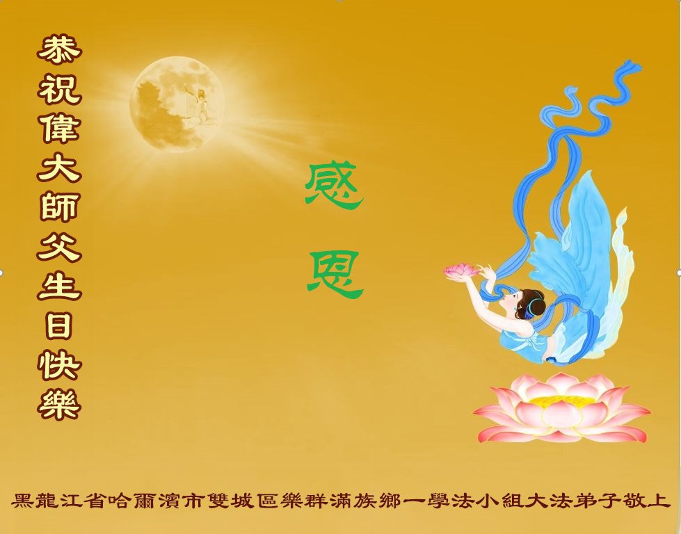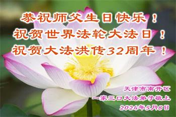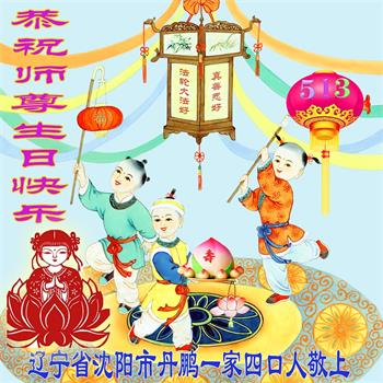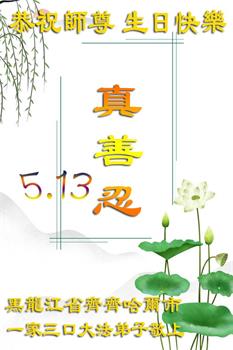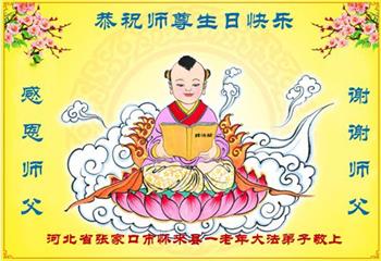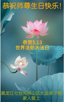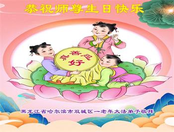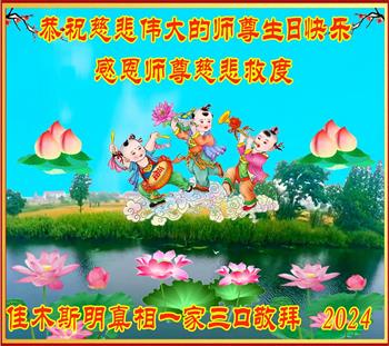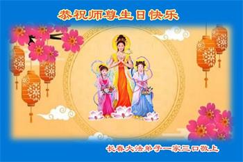我是年轻妈妈,炼功四月有余,感受到大法的超常与神奇,身体与身心都得到了净化,谢谢师父的慈悲救度。我代表修炼多年的婆婆还有小弟子及全家人恭祝师尊生日快乐! 感谢师尊的慈悲救度,感谢对我们全家人的呵护,我要好好修,我们全家人都想跟您回家。
