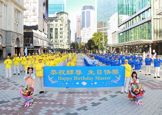 五月十一日,新西兰法轮功学员在奥克兰市中心伊丽莎白广场庆祝世界法轮大法日及大法弘传三十二周年,并恭祝伟大的师尊生日快乐。