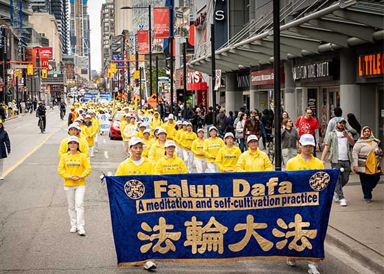 五月十一日,为庆祝世界法轮大法日,加拿大多伦多法轮功学员在市中心举办了大游行。学员们在修炼法轮大法后,品行变得高尚、光明。