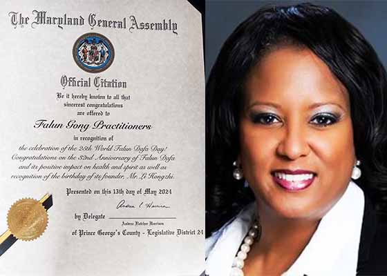 二零二四年五月十三日是第二十五届世界法轮大法日,美国马里兰州众议员安德烈安·哈里森向法轮功学员颁发褒奖证书。