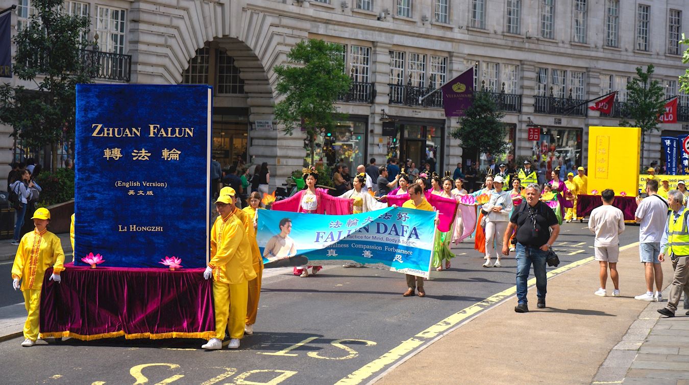游行队伍包括腰鼓队、仙女队、舞龙队、功法展示、三退保平安等多个方阵组成,从中国大使馆门前出发,途经伦敦市中心地段的最繁华商业干道和唐人街,途中旌旗招展、锣鼓喧天,展示法轮大法的美好。