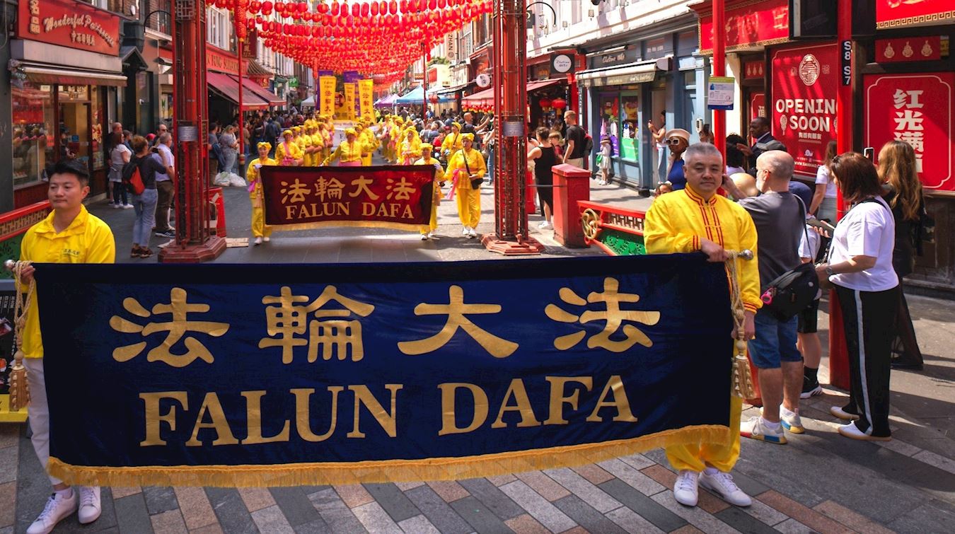 '图7~9:法轮功学员游行队伍经过伦敦唐人街'