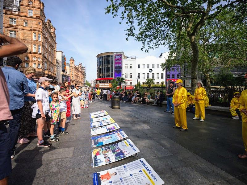 壮观的游行队伍吸引了众多路人纷纷拍照、录像。最后在圣马丁广场,法轮功学员举行新闻发布会。并在圣马丁广场、莱斯特广场和唐人街展开一天的弘法活动。