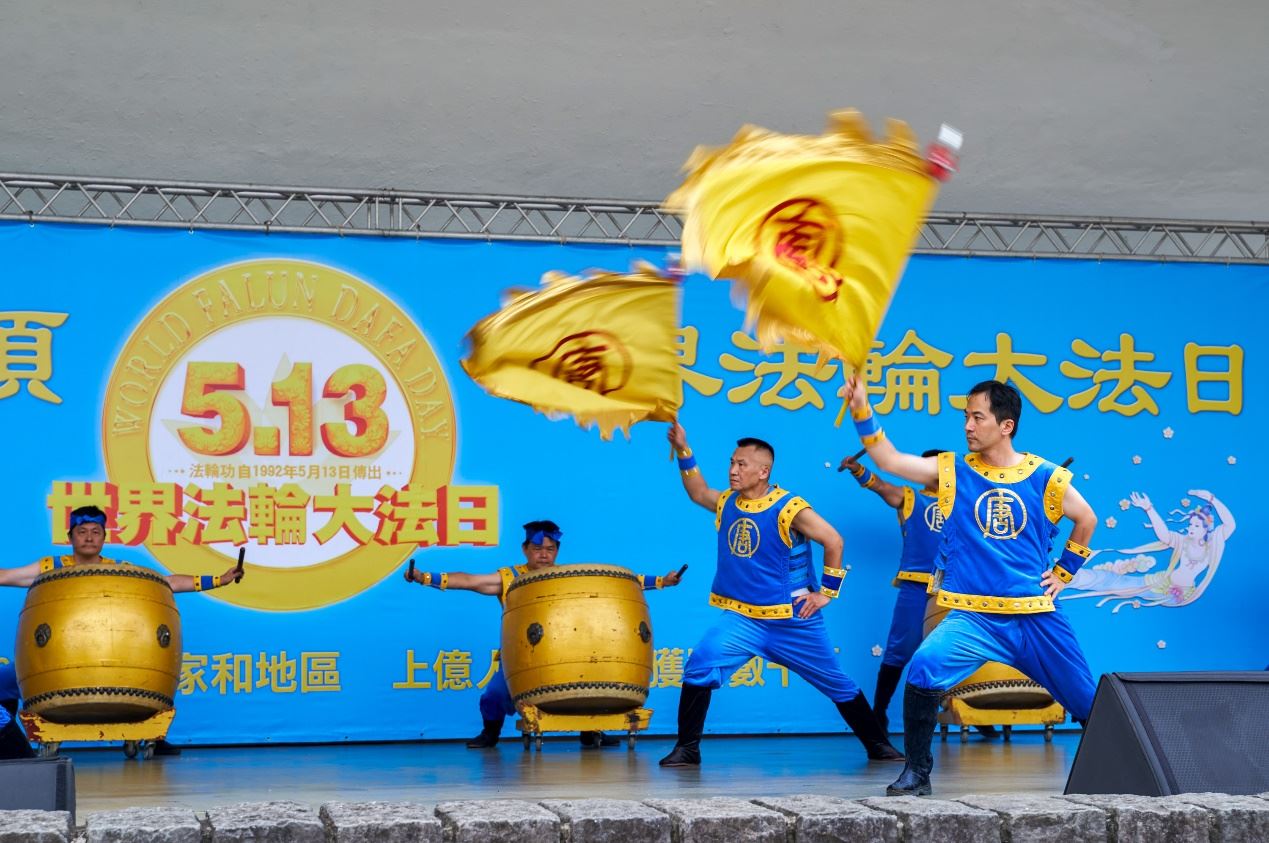 图1~3:二零二四年五月十一日下午,新唐人旗鼓队、天国乐团、腰鼓队于台北二二八和平公园音乐台演出。