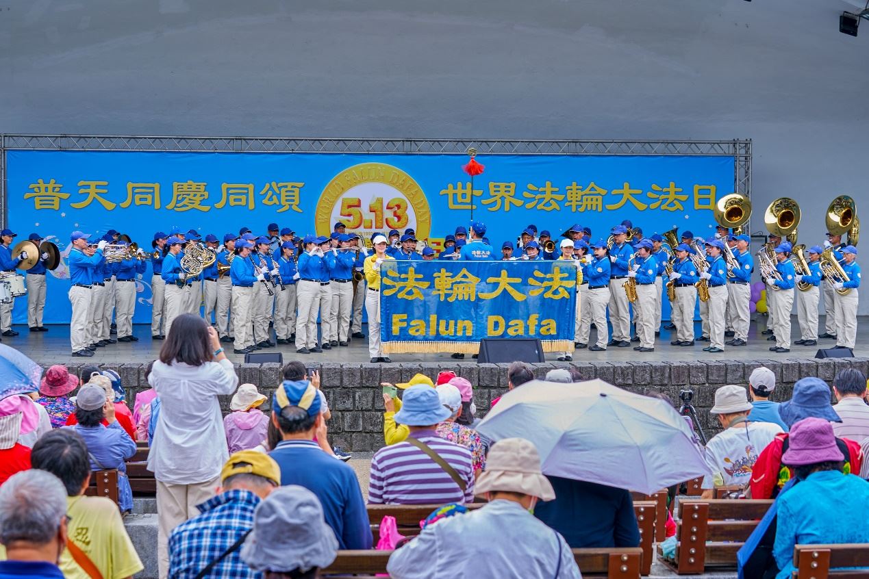 '图1~3:二零二四年五月十一日下午,新唐人旗鼓队、天国乐团、腰鼓队于台北二二八和平公园音乐台演出。'