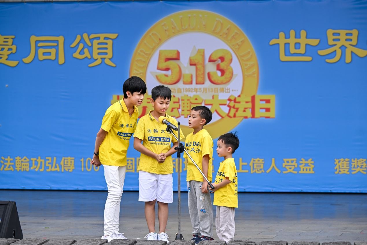 庆祝活动中,还有法轮功小弟子上台背诵《洪吟》经文,大法小弟子们背法声音洪亮,精神抖擞,赢得满堂彩。