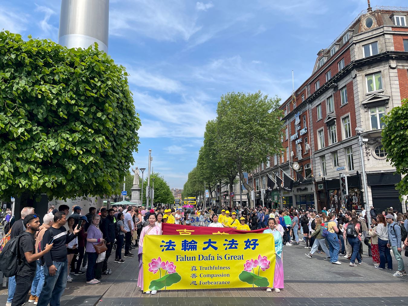 '图1~3:二零二四年五月十一日,爱尔兰法轮功学员在首府都柏林举行游行。欢庆世界法轮大法日。'