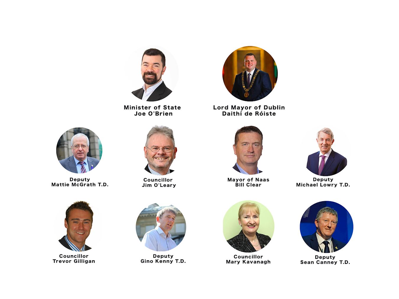 第二排从左至右:爱尔兰众议员马蒂・麦格拉斯(Mattie McGrath)、郡议员吉姆・奥利里(Jim O'Leary)、郡议员比尔・克莱尔(Bill Clear)、众议员麦克尔・路瑞(Michael Lowry)