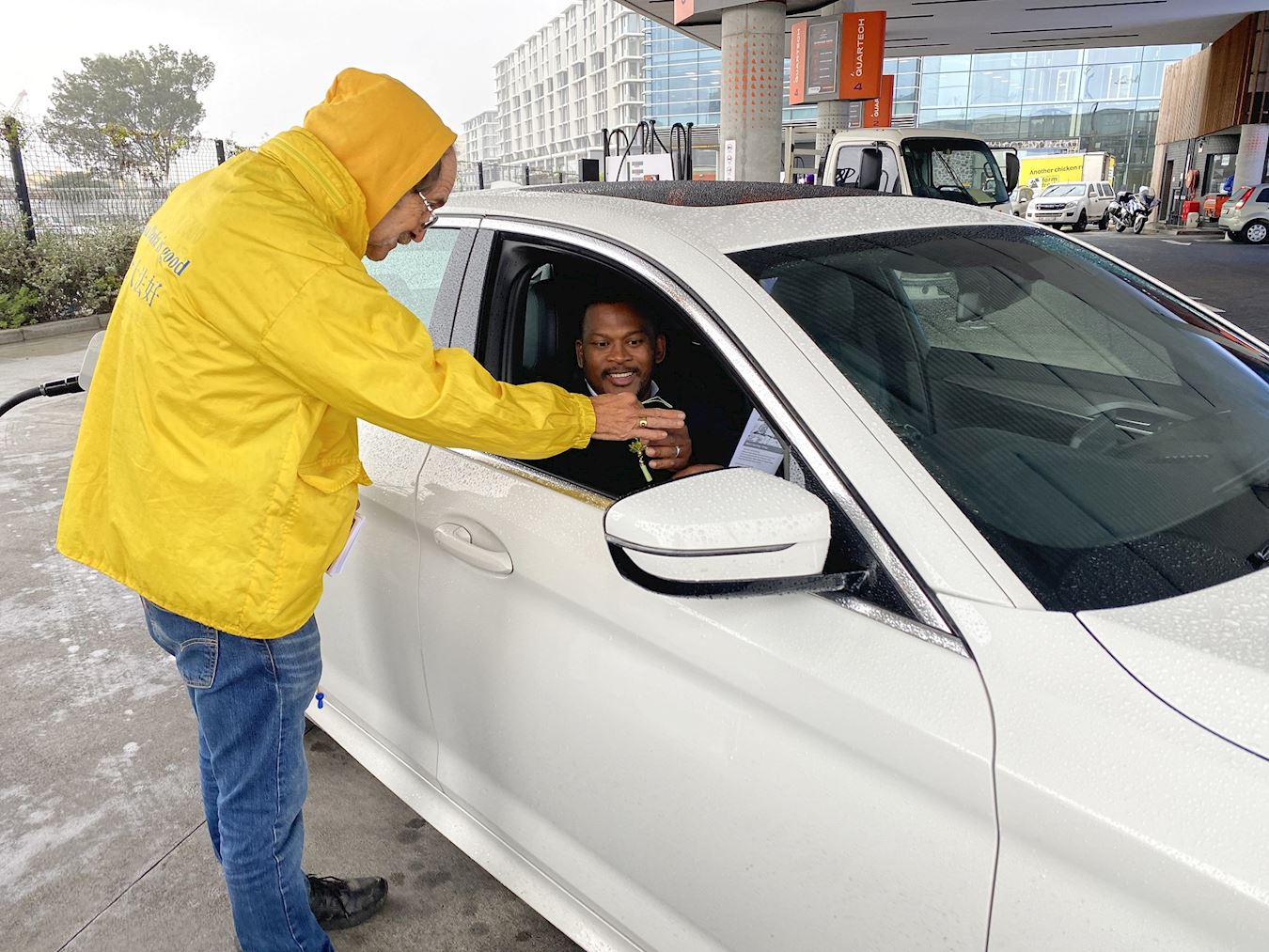 图1~3:二零二四年五月十日,南非法轮功学员来到码头附近的加油站向市民派真相传单、讲真相,传递法轮大法的美好。