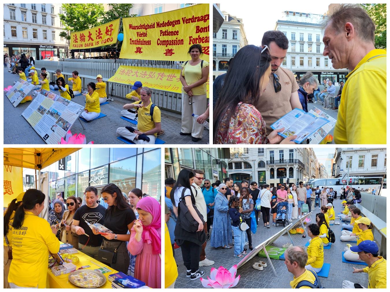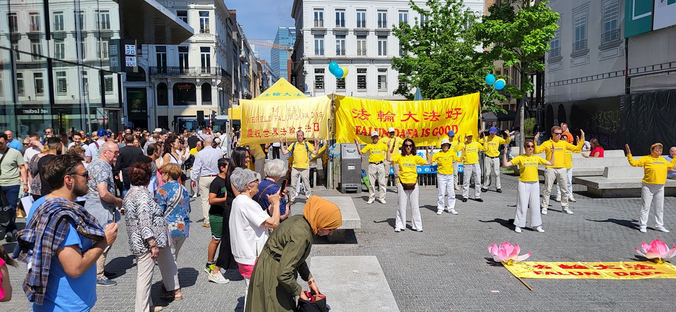 拉莫奈(La Monnaie)广场以拉莫奈皇家剧院命名,与商业大街衔接。周末是各种活动场所所在地。这天也不例外,另一边还有一个音乐集会,音乐的吵闹声很大。但是并不影响学员祥和宁静的炼功场。强烈的对比下,让很多人过来了解法轮大法。