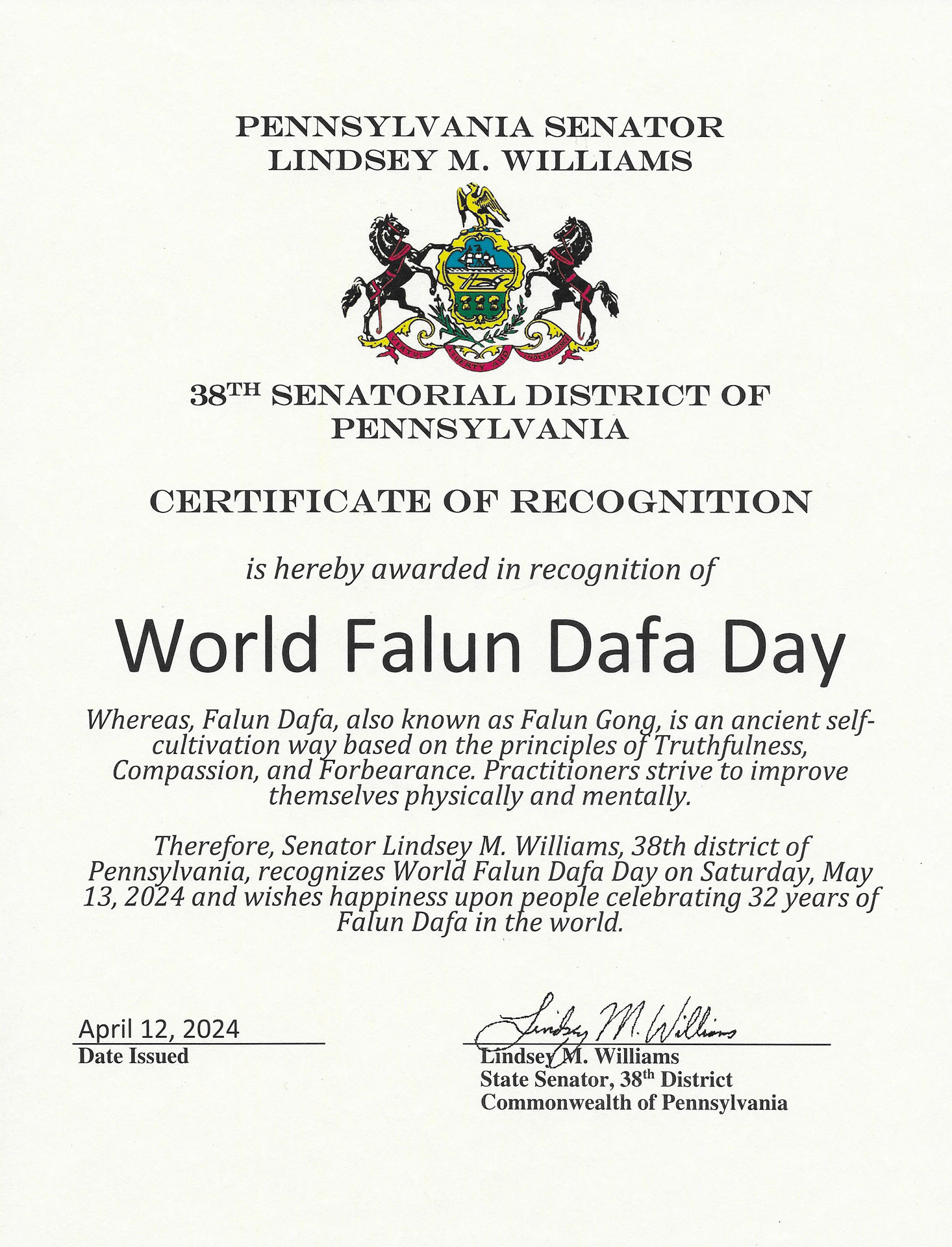 宾州第38区参议员林赛‧威廉姆斯(Lindsey Williams)在表彰证书中写道:“鉴于法轮大法,也叫法轮功,是按真、善、忍为准则的古老自我修炼功法。修炼者努力地改善自己的身心健康。因此,宾州第38区参议员林赛‧威廉姆斯认可二零二四年五月十三日为世界法轮大法日,并祝愿大家庆祝法轮大法弘传世界32周年快乐。”