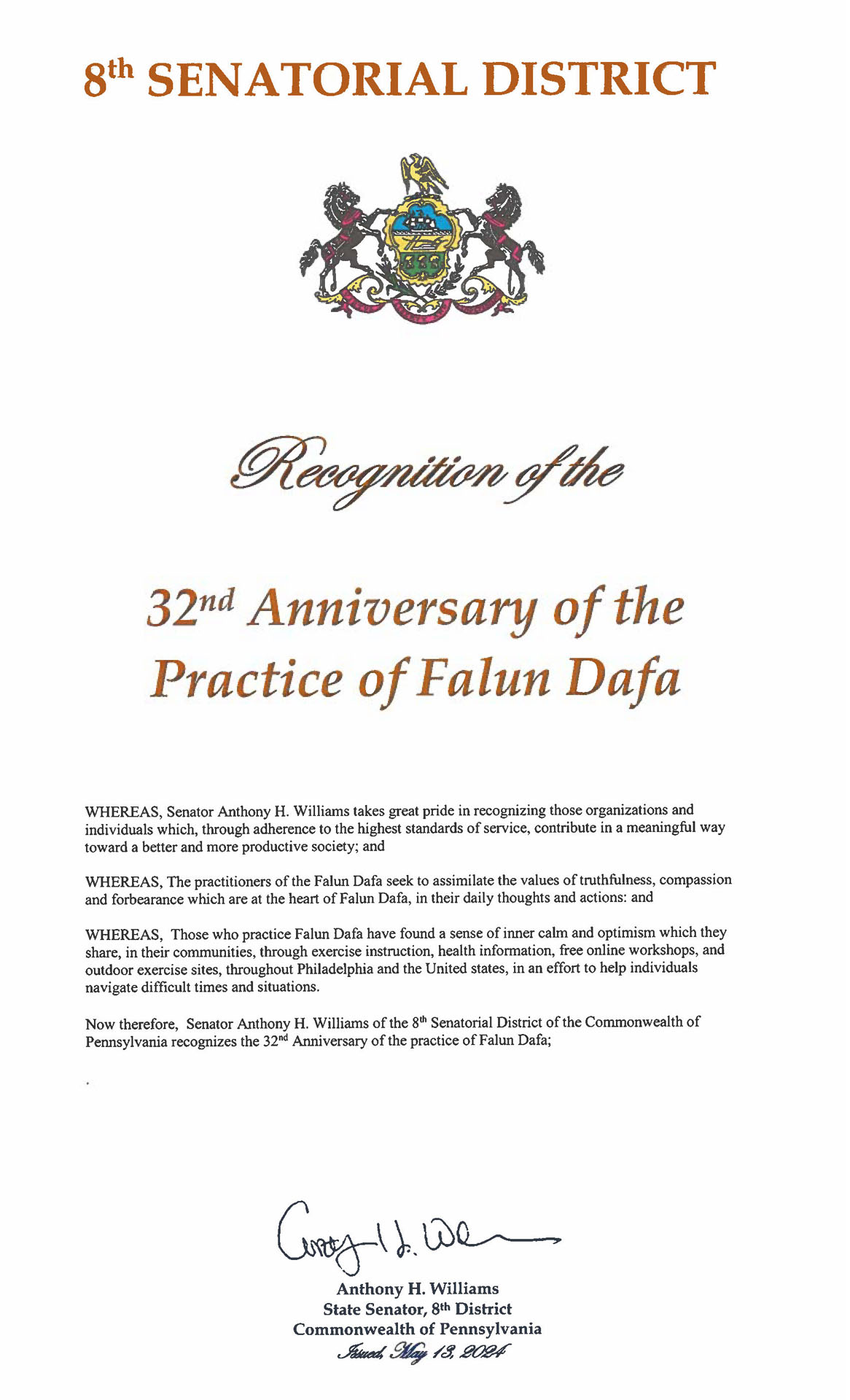 宾州参议院第八选区参议员安东尼‧威廉姆斯(Anthony H. Williams)颁发证书表彰法轮大法传世32周年。证书中写道:“鉴于,参议员安东尼‧威廉姆斯非常自豪能够表彰那些通过坚持最高服务标准,为建设一个更美好、更有生产力的社会做出有意义贡献的组织和个人。