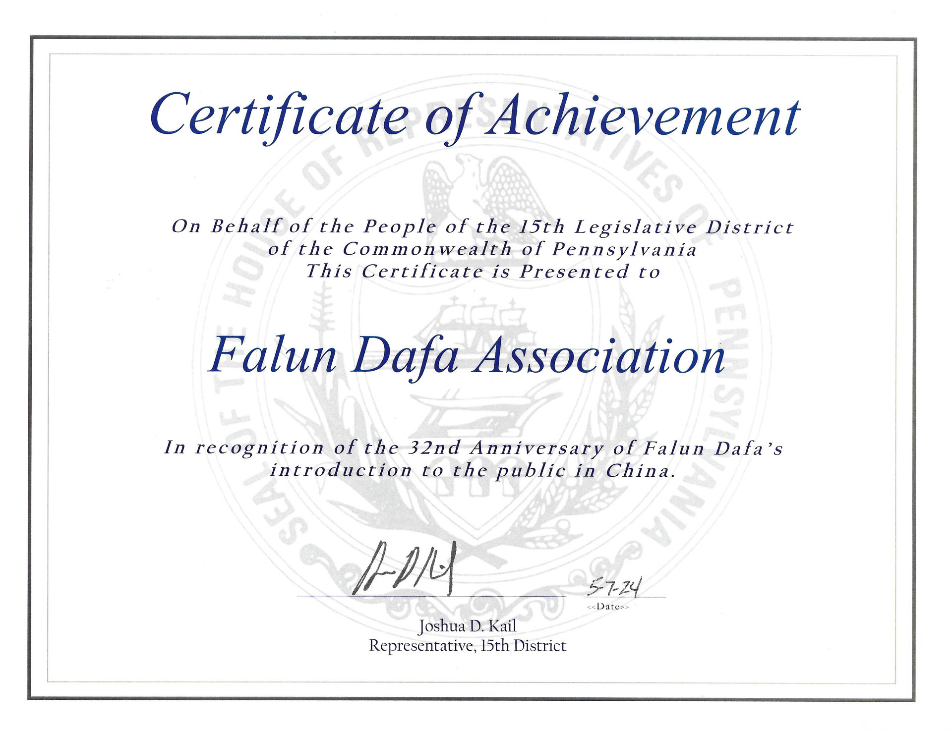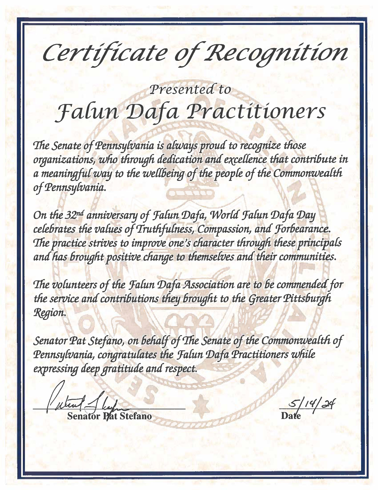 宾州参议院第八选区参议员帕特‧斯特凡诺(Pat Stefano)颁发证书表彰法轮大法学员,上面写道:“在法轮大法传世32周年之际,法轮大法日庆祝真、善、忍的价值观。”“代表宾州参议院庆祝这一节日,并对法轮大法学员表达深深的感激和尊敬。”