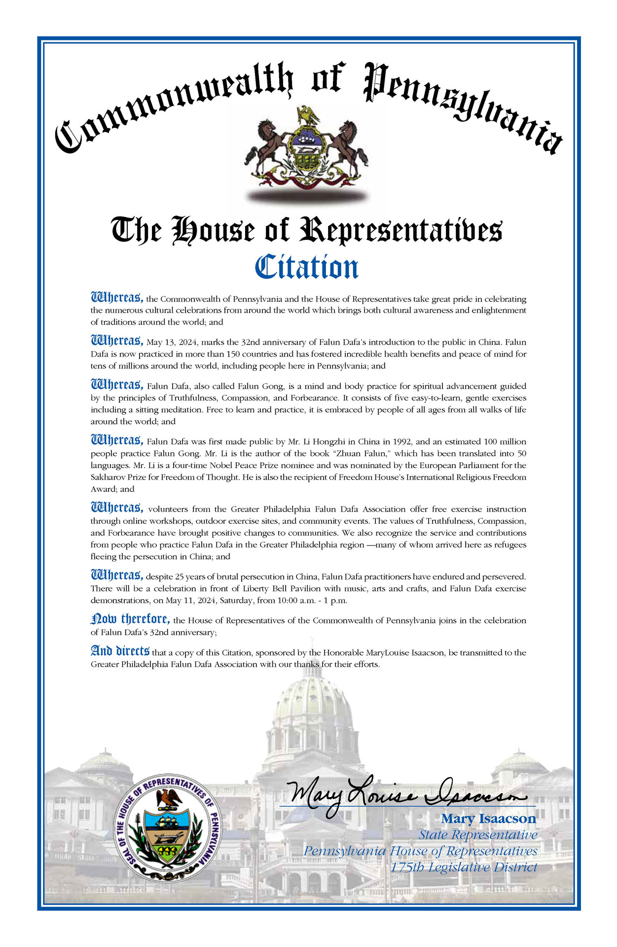 宾州众议院颁发褒奖,褒奖由宾州第175区众议员玛丽‧艾萨克森(Mary Isaacson)发起,庆祝世界法轮大法日,感谢法轮大法学员将法轮大法教导的真、善、忍原则弘传世界。