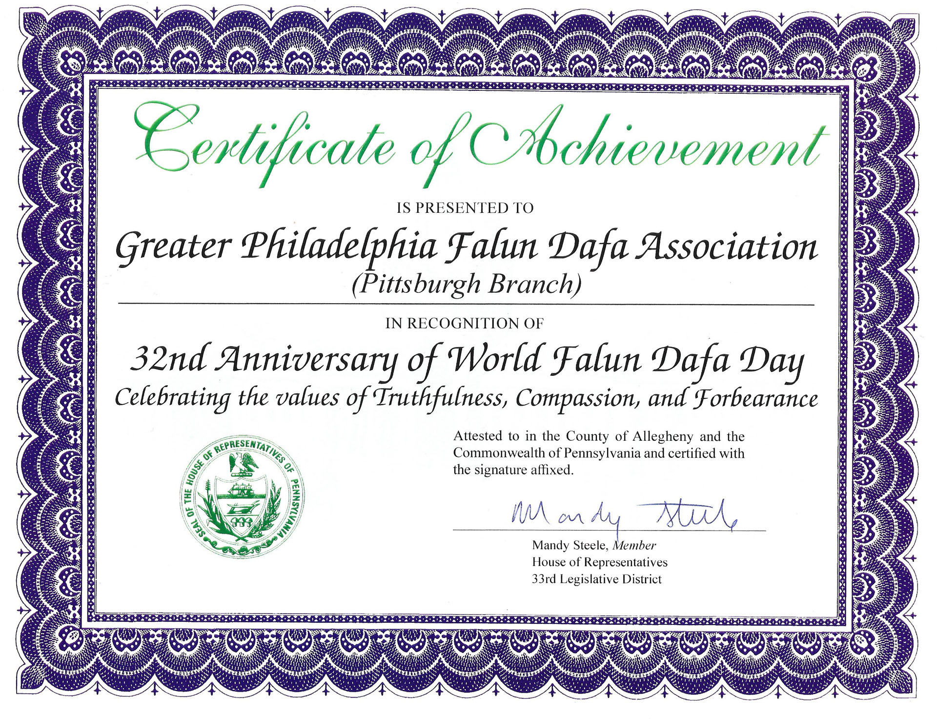 第33区众议员曼迪‧斯蒂尔(Mandy Steele)给大费城法轮大法学会(匹兹堡地区)颁发褒奖状,“祝贺法轮大法弘传世界32周年,庆祝真、善、忍的价值观。”