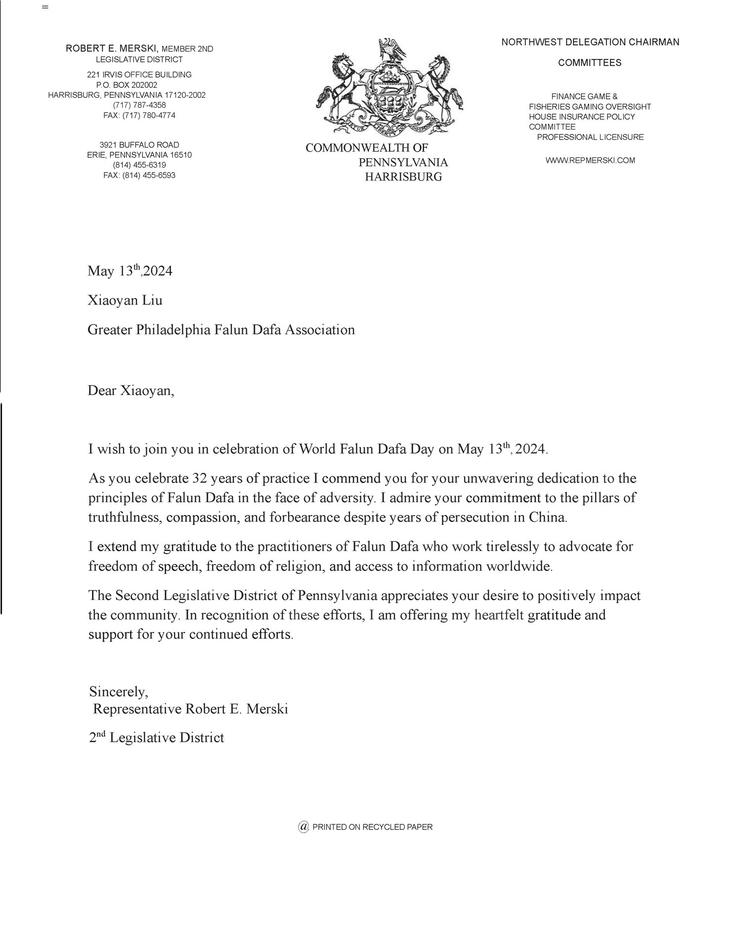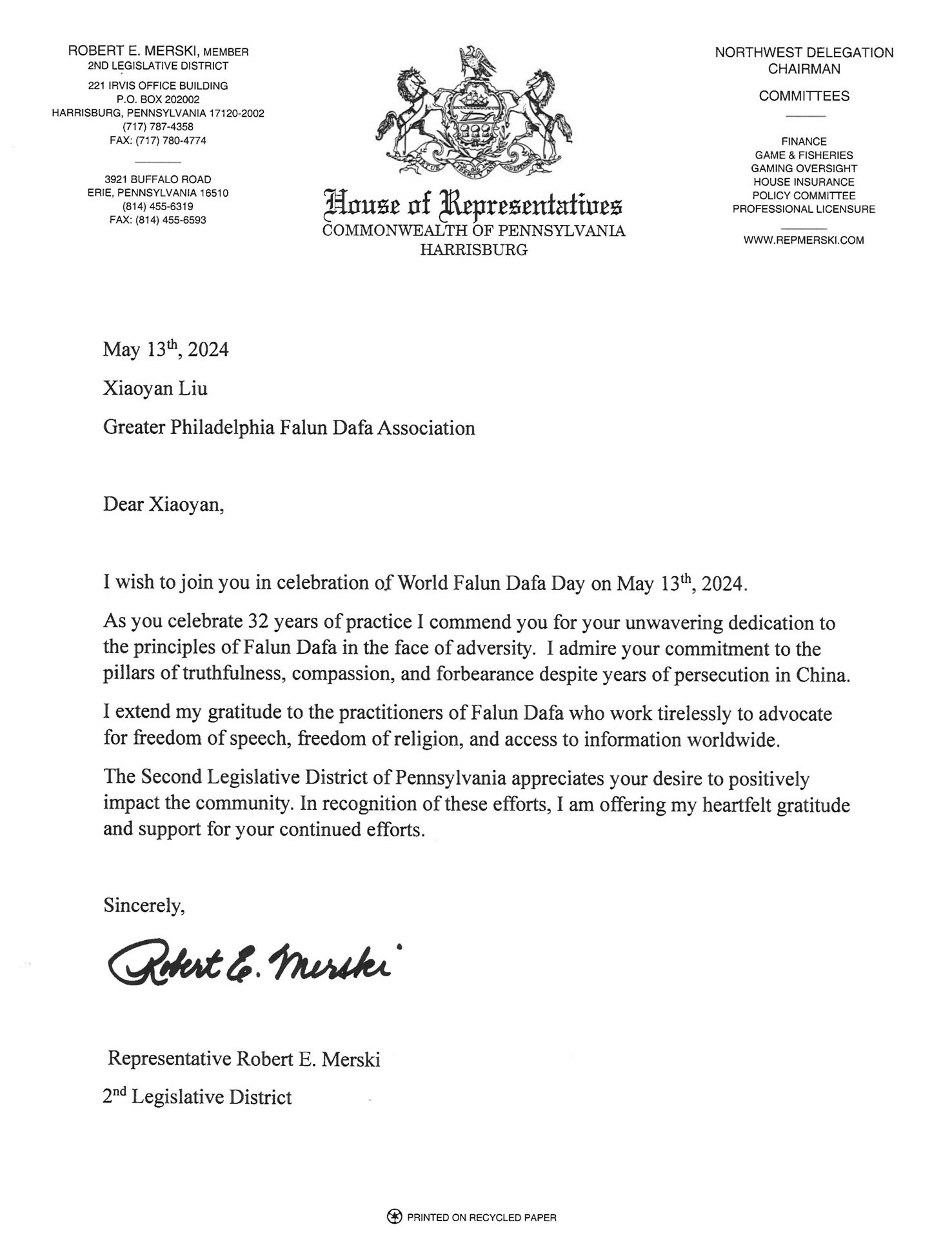 宾州第2区众议员罗伯特‧梅尔斯基(Robert E. Merski)发来贺信,赞扬法轮功学员为坚持信仰自由所做出的努力。信中写道:“我希望和你们一起庆祝二零二四年五月十三日世界法轮大法日。