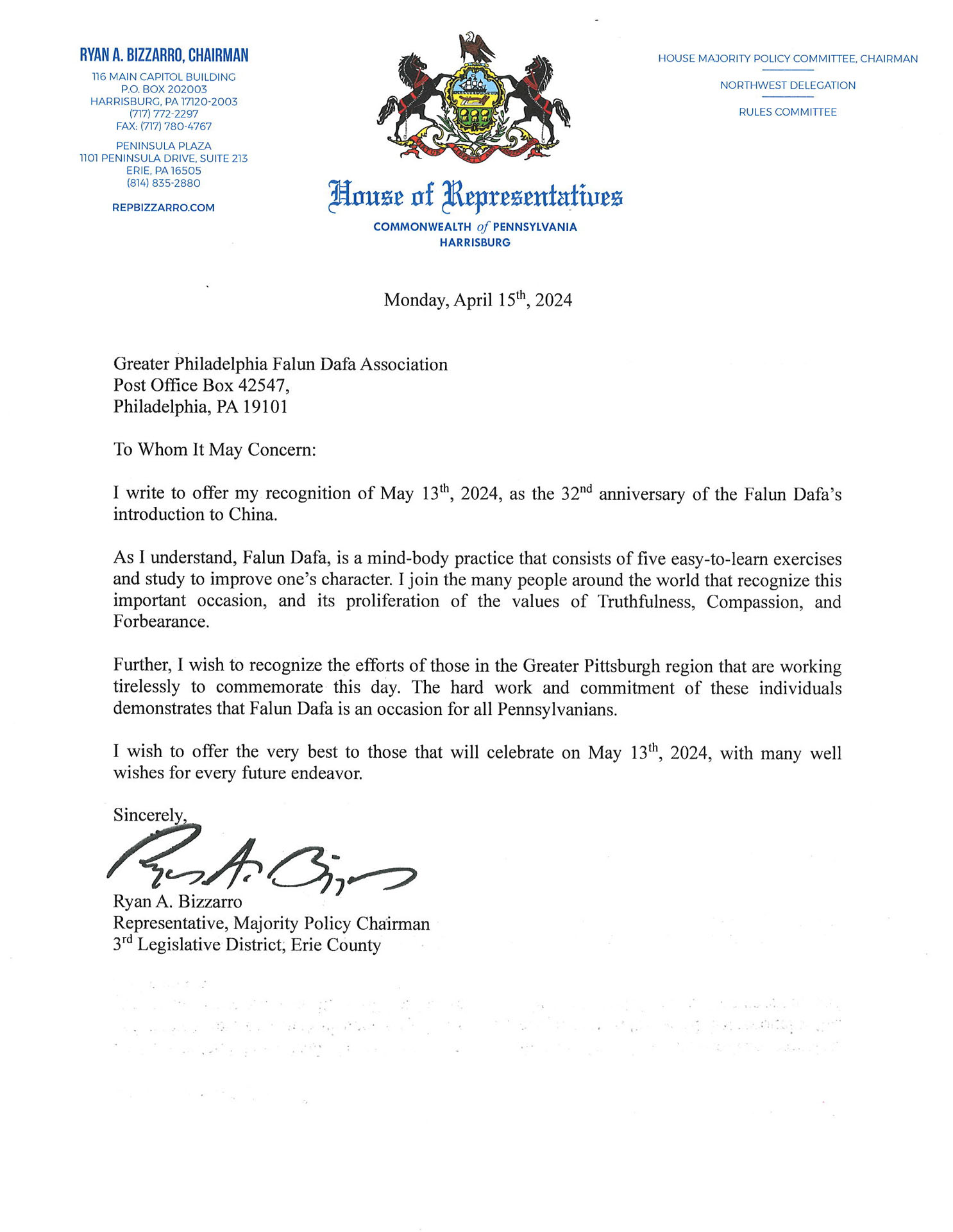 宾州第3区众议员瑞安‧比扎罗(Ryan A. Bizzarr)为庆祝法轮大法弘传世界32周年发来贺信,称法轮大法是所有宾州人的机会。信中写道:“据我了解,法轮大法是一种身心修炼,由五套简单易学的炼功和修炼组成,以提高人的心性。我与世界各地的许多人一起认识到这一重要时刻,以及对真、善、忍价值观的传播。”“此外,我还要感谢大匹兹堡地区人们为庆祝这个日子所做的不懈努力。这些人的辛勤工作和奉献精神表明法轮大法是所有宾州人的一个机会。我希望向那些将在二零二四年五月十三日庆祝的人们致以最美好的祝愿,并祝愿他们今后的一切顺利。”