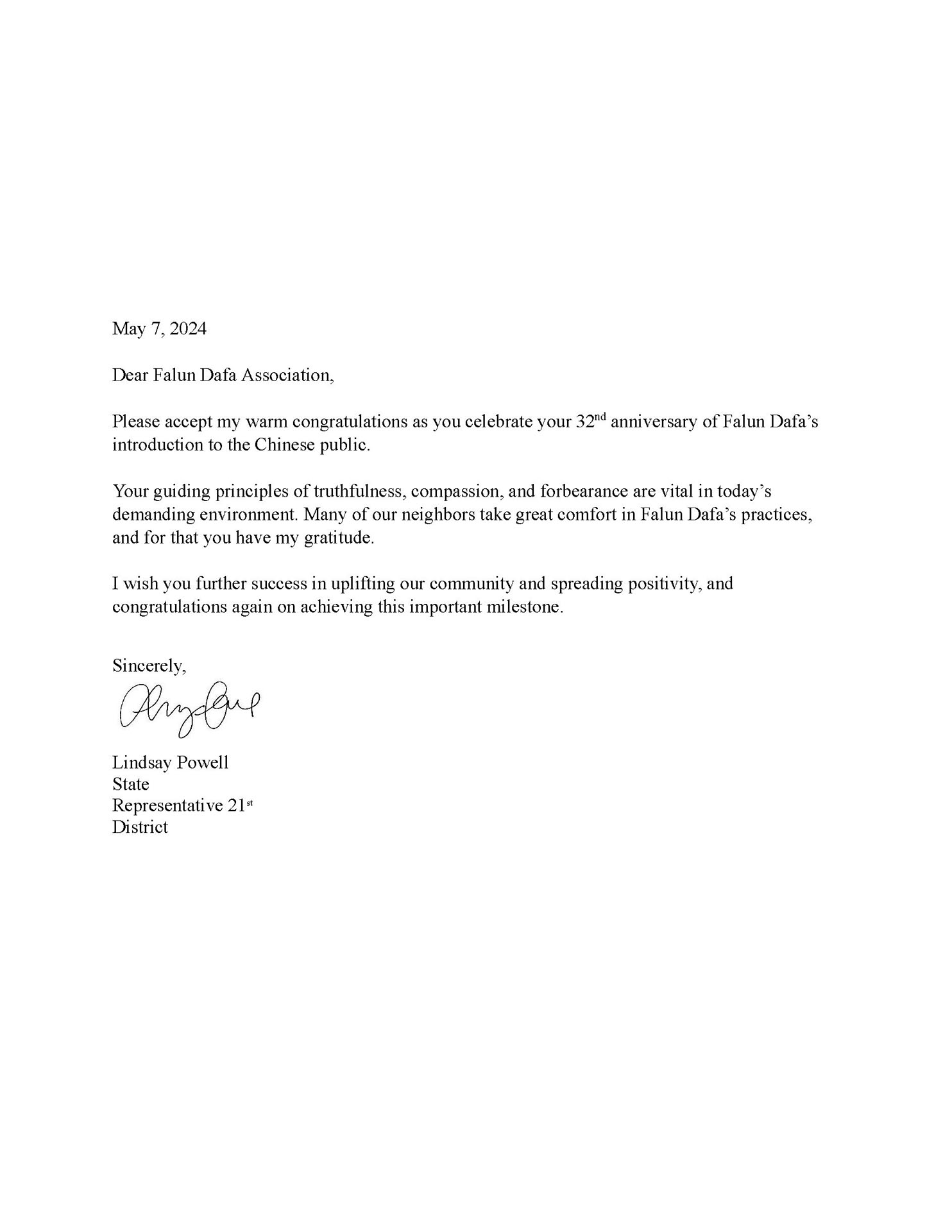 宾州第3区众议员林赛‧鲍威尔给法轮大法学会发来贺信,感谢法轮大法传出了真、善、忍的指导原则,在当今的社会尤为重要。信中写道:“在你们庆祝法轮大法自中国传出32周年之际,请接受我热烈的祝贺。你们的指导原则真、善、忍在当今苛刻的环境中至关重要。我们的许多邻里在法轮大法的修炼中受益极大,为此我向你们表示感谢。”“我衷心祝愿你们在振奋社会、传播正能量方面取得更大的成功,并再次祝贺你们实现了这一重要的里程碑。”