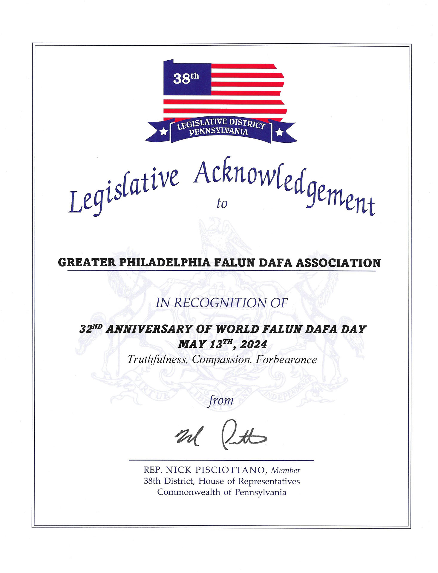 宾州第38区众议员尼古拉斯‧皮斯奥塔诺(Nickolas Pisciottano)颁发褒奖证书,“感谢大费城法轮大法学会,认可五月十三日第32届世界法轮大法日,以及真、善、忍。”
