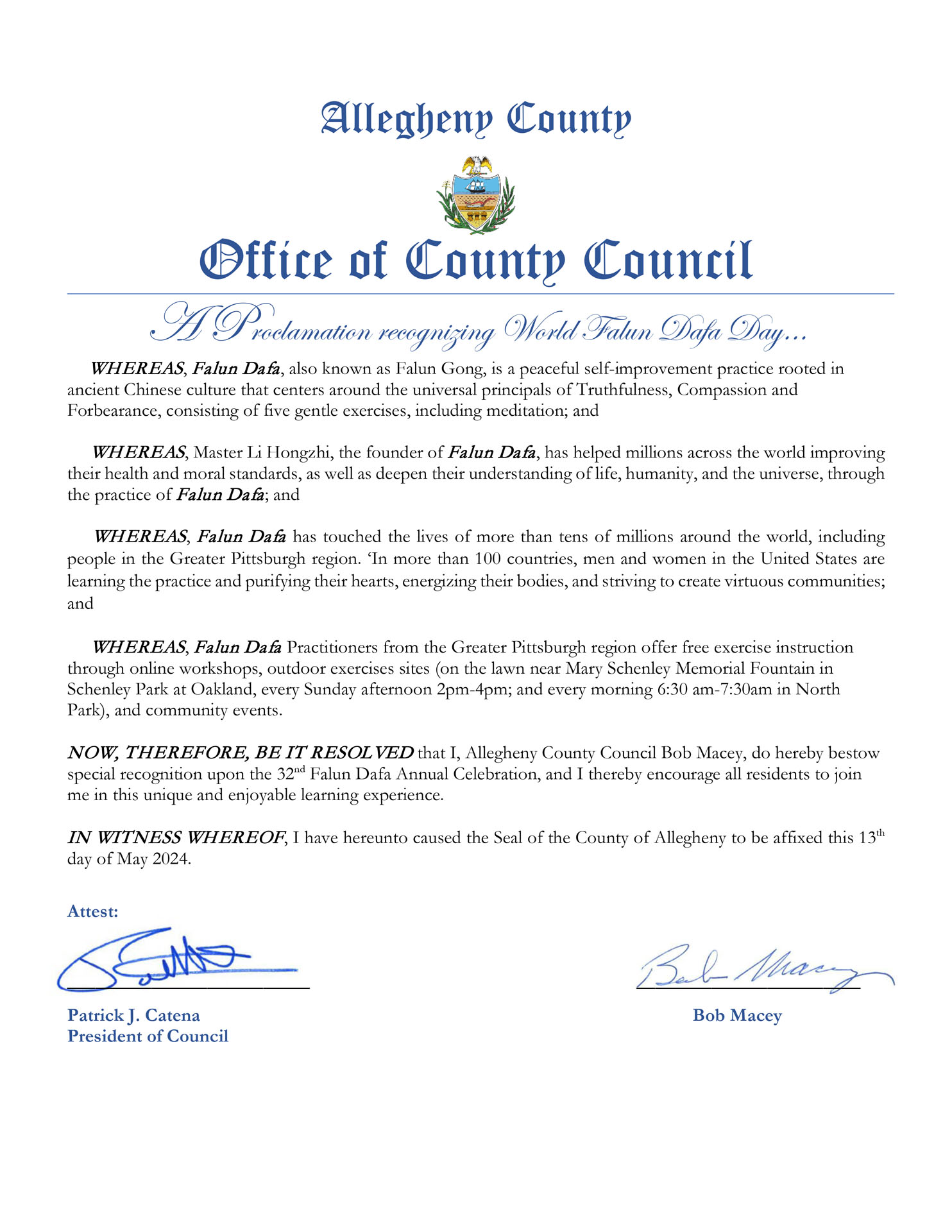 宾州阿勒格尼(Allegheny)县行政长官帕特里克‧卡特纳(Patrick J. Catena)和县议员鲍勃‧梅西(Bob Macey)签署颁发了世界法轮大法日褒奖状,鼓励居民学炼法轮功。褒奖状上写道:“法轮大法创始人李洪志大师,帮助全世界数百万人通过修炼法轮大法而改善了健康和道德水平,并加深了对生命、人类和宇宙的理解。”“法轮大法已经影响了全世界数千万人的生活,包括大匹兹堡地区的人们。在100多个国家,美国的男男女女都在学习修炼,净化他们的心灵,给他们的身体注入活力,并努力创造良性社区。”