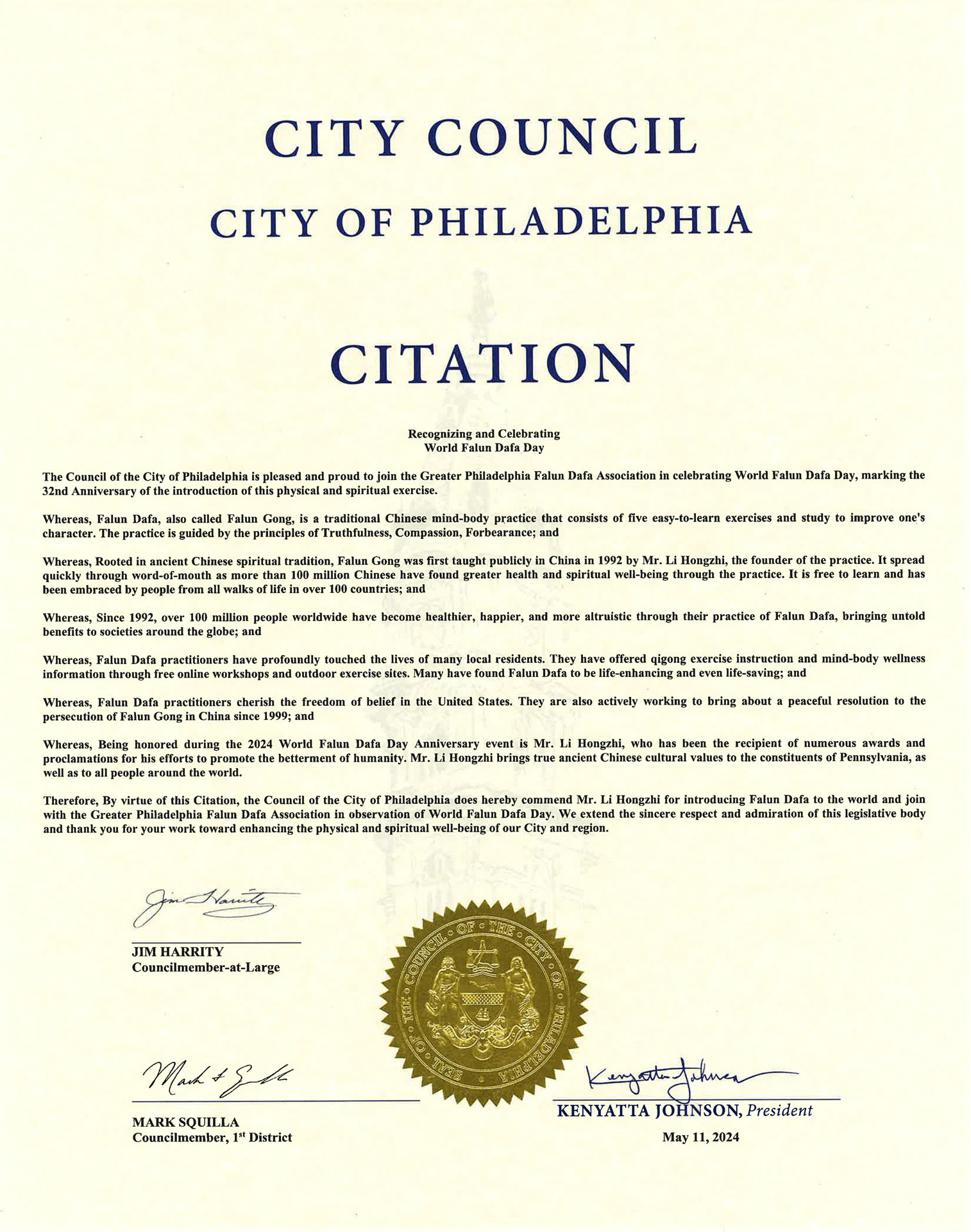 褒奖状写道:“费城市议会很高兴又很自豪地与大费城法轮大法学会一起庆祝世界法轮大法日,庆祝这一身心修炼功法传世32周年。”“自一九九二年以来,全世界有一亿多人通过修炼法轮大法变得更健康、更快乐、更利他,给全球社会带来了无尽的利益。”“法轮大法学员珍惜美国的信仰自由。他们还致力于和平地呼吁停止自一九九九年以来中共对法轮功的迫害。”
