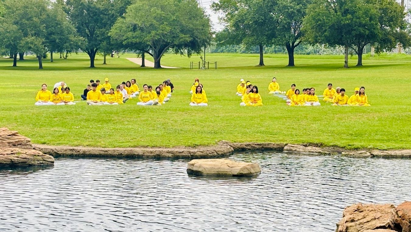 图1~2:二零二四年五月十二日,休斯顿及部分来自奥斯汀、大学城以及新布朗费尔斯的法轮功学员在休斯顿西南区的蚌溪公园举行集体炼功。
