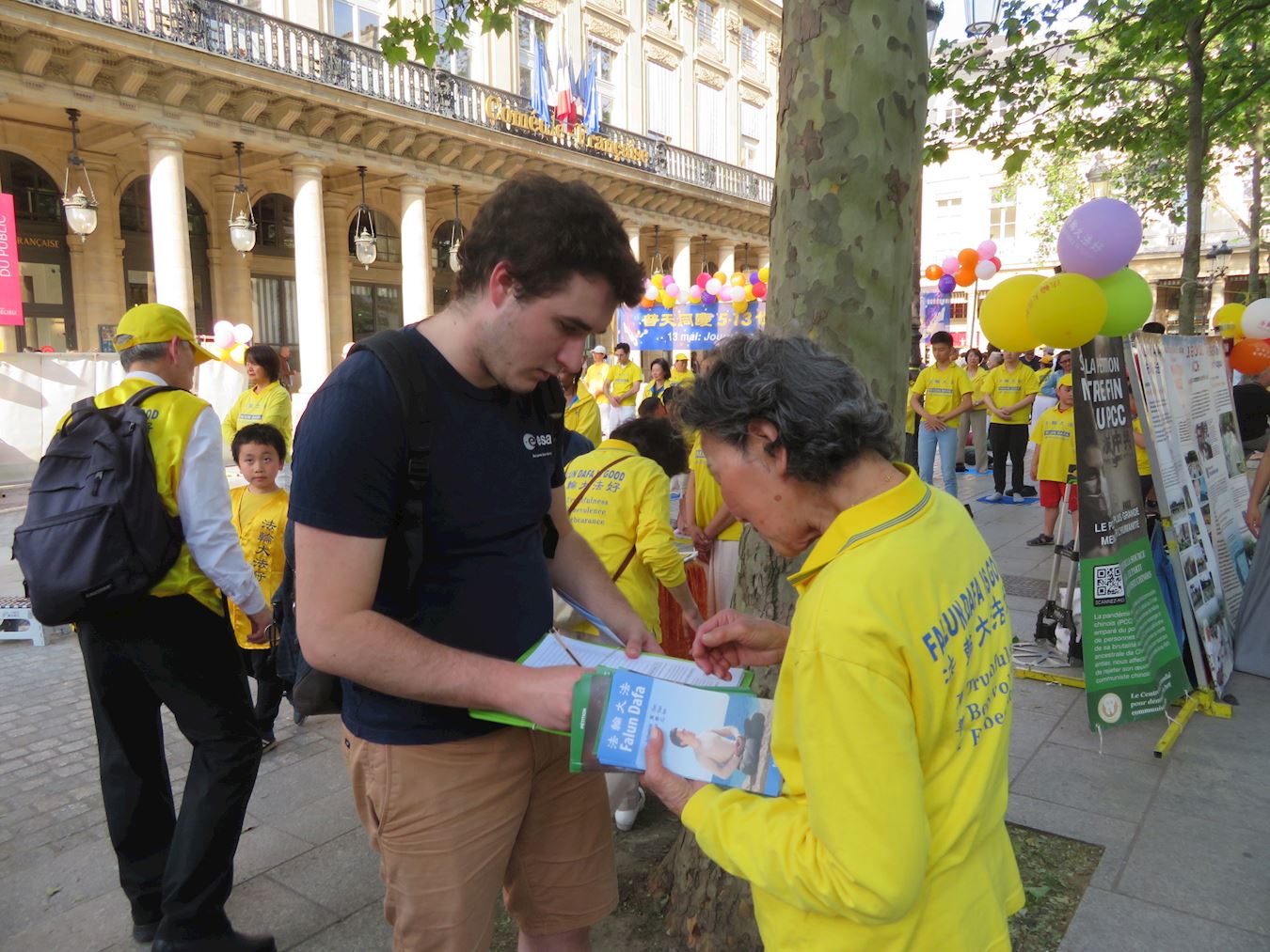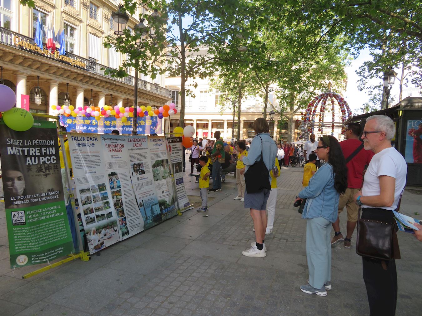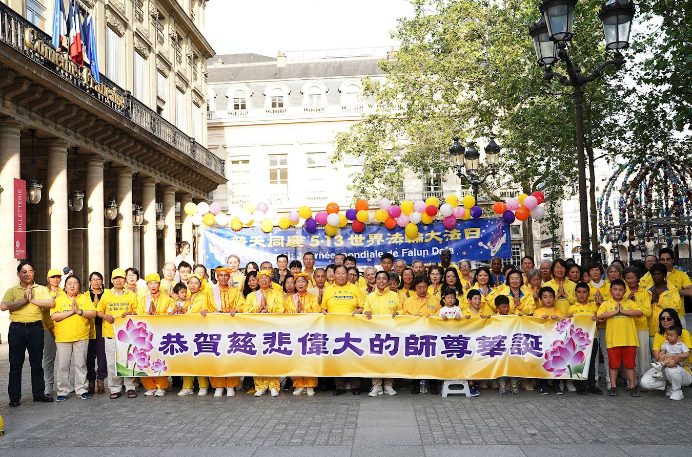 为庆祝法轮大法日,二零二四年五月十二日,法国西部地区部分大法弟子在雷恩(Rennes)市进行了集体炼功活动。五月十一日傍晚,巴黎部分大法弟子在卢浮宫旁的柯莱特广场(Place Colette)举行了集体炼功和讲真相活动。活动吸引了来往的民众和游人。看到法轮功学员祥和的功法表演,人们赞扬真、善、忍是人们在生活中应该拥有的价值。