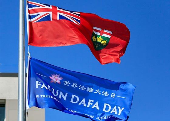 - 加拿大康沃尔市举行升旗仪式 庆世界法轮大法日- 五月十三日,加拿大安大略省康沃尔市市长贾斯汀·汤戴尔主持了在该市市政府前的升旗仪式,庆祝法轮大法弘传世界三十二周年。