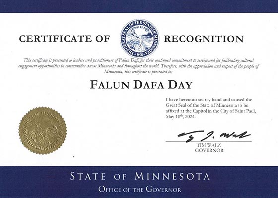 - 美国明尼苏达州州长表彰法轮大法- 法轮大法弘传世界三十二周年之际,美国明尼苏达州州长沃尔兹发出表彰,表达对法轮大法的创始人的敬意,并庆祝五月十三日世界法轮大法日。