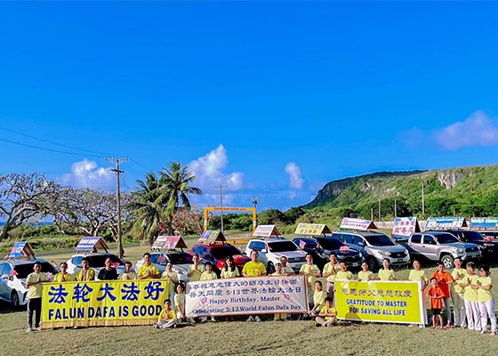 - 庆祝法轮大法日 塞班岛学员传递大法美好- 五月十三日,美国塞班岛部分法轮功学员举行了弘法、讲真相,以及环岛“庆祝世界法轮大法日”车队游行的活动,向市民传递大法的美好,祝贺师尊生日快乐。