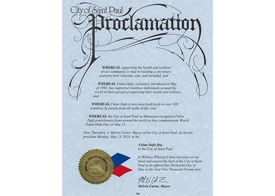 - 美国明尼苏达州州府褒奖法轮大法- 法轮大法弘传世界三十二周年之际,美国明尼苏达州州府圣保罗市市长麦文·卡特发出褒奖,庆祝五月十三日世界法轮大法日。