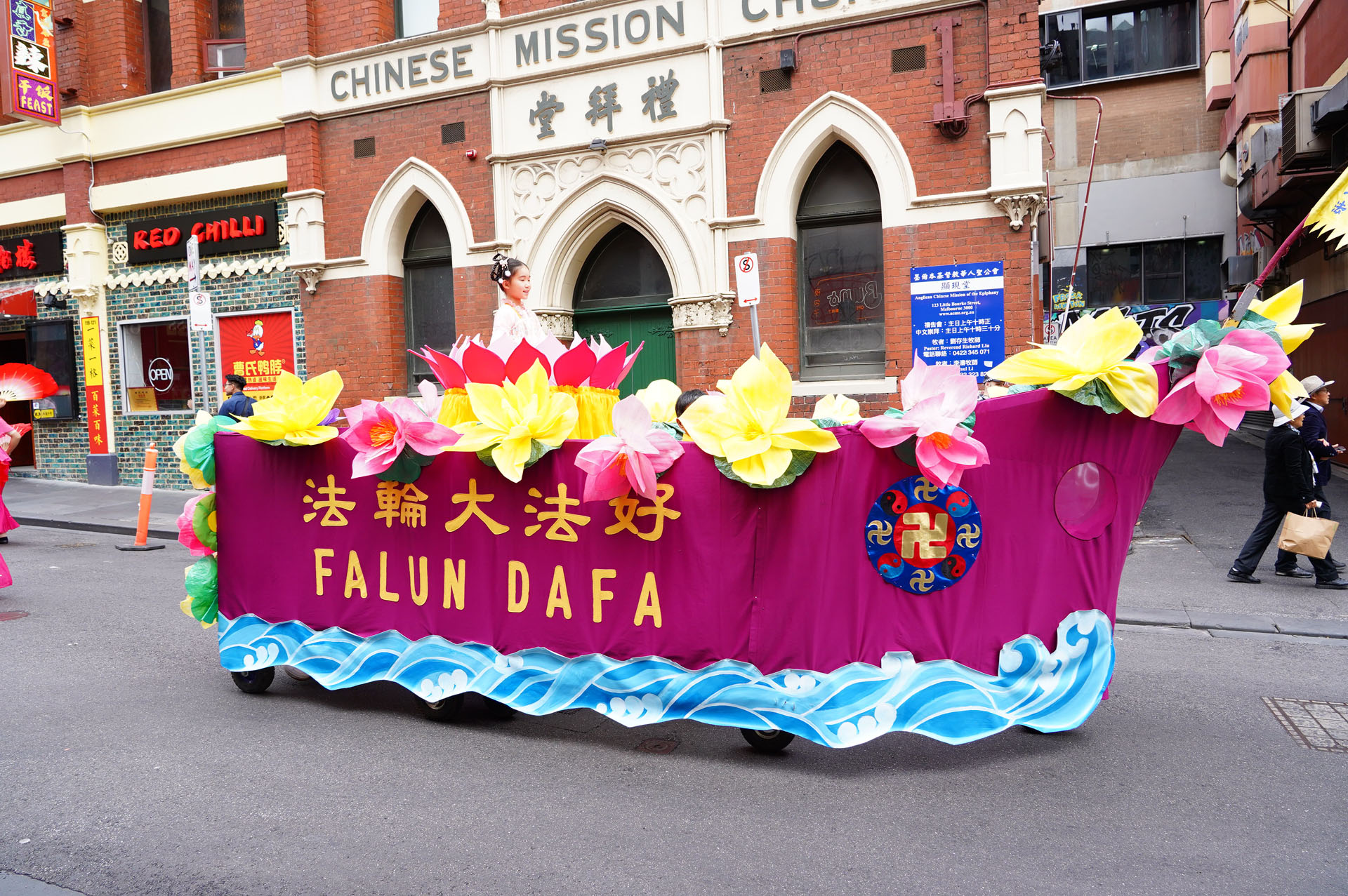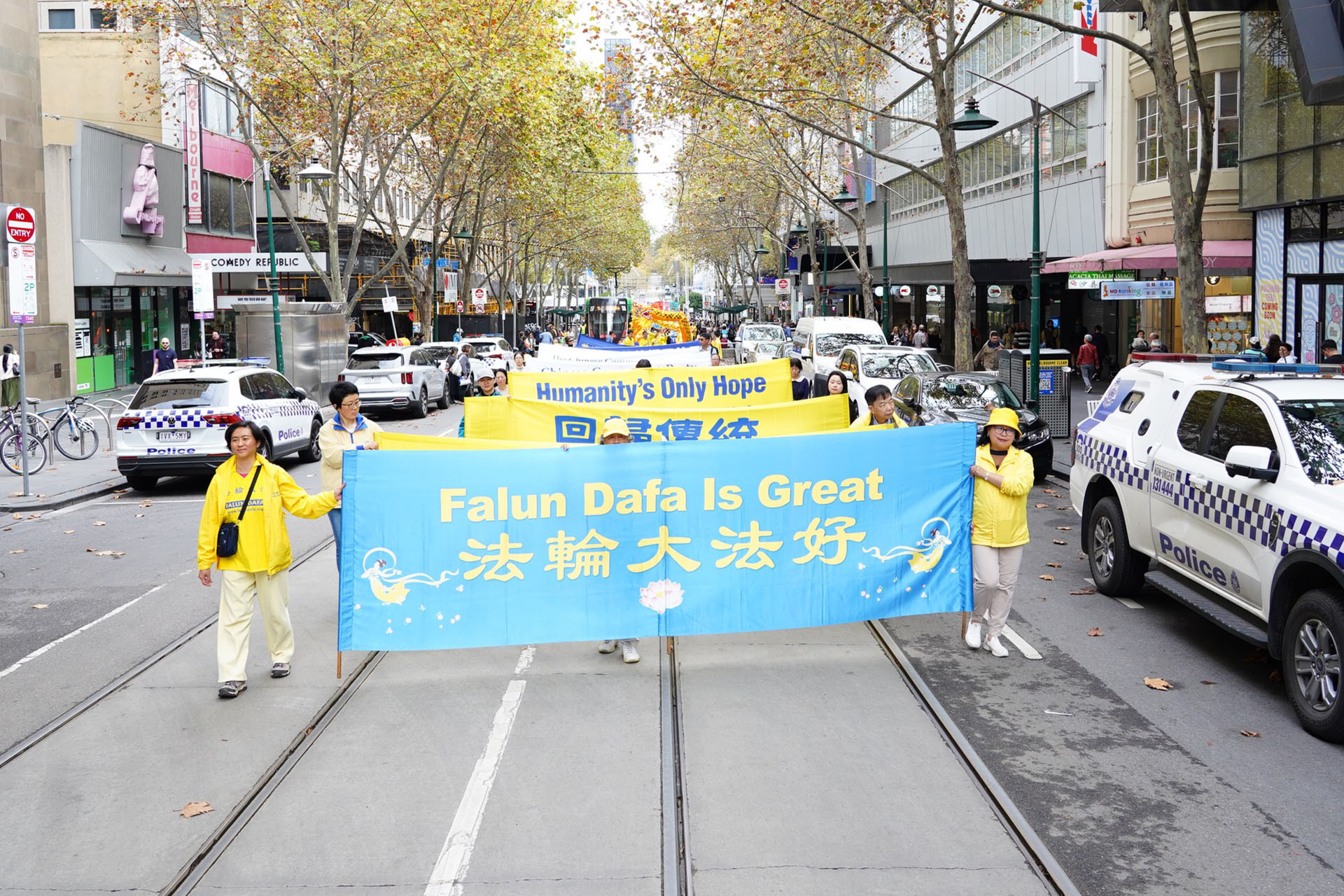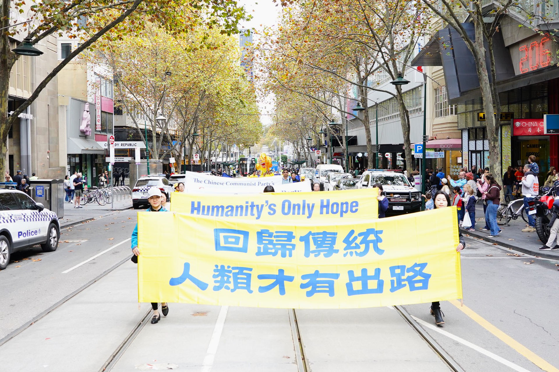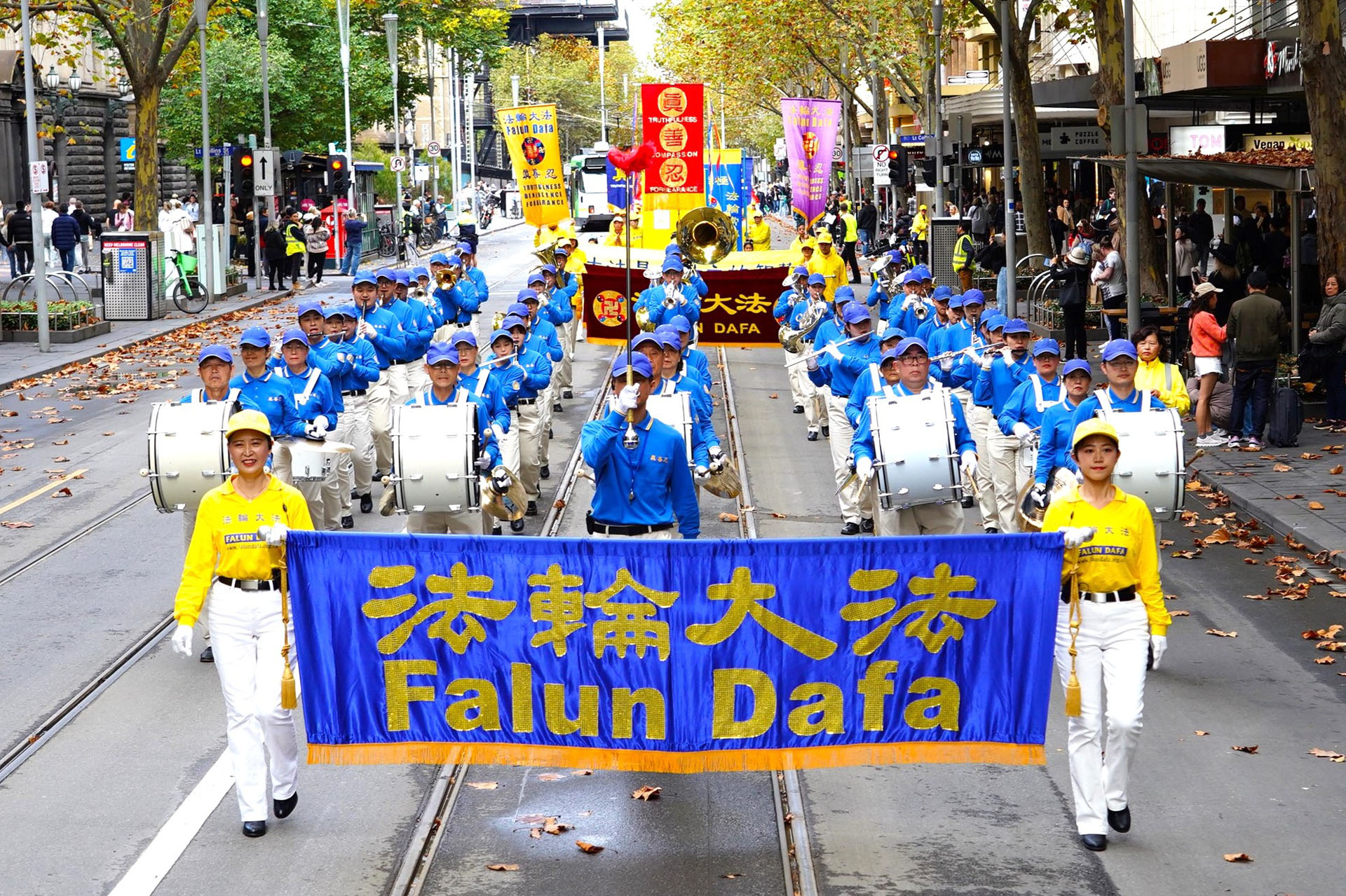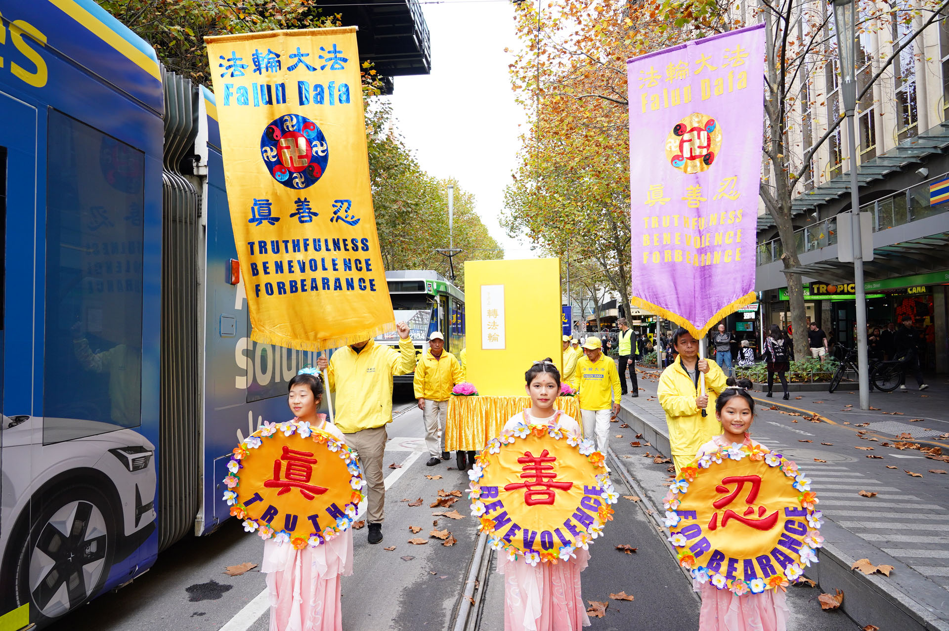 当天中午约十二点,警车开道,天国乐团引领,游行队伍从维多利亚女王花园(Queen Victoria Gardens)出发。游行队伍壮观祥和、色彩缤纷,各族裔、各年龄段法轮功学员组成的众多方阵令人目不暇接。游行队伍穿过市中心多条主干道、闹市区及唐人街,很多人驻足欣赏,不少人用手机拍摄下这难忘的一幕。