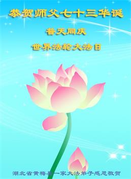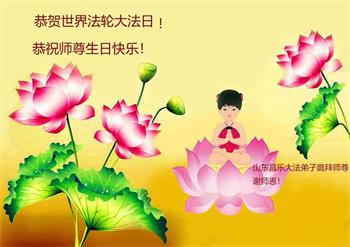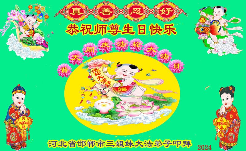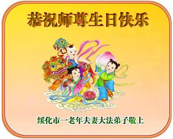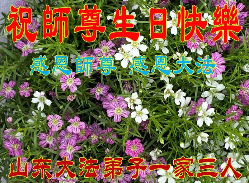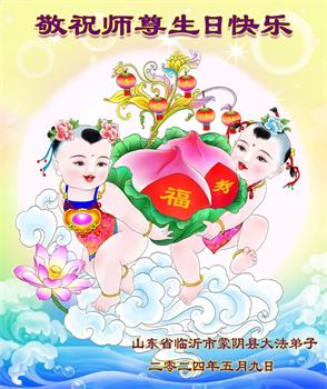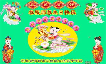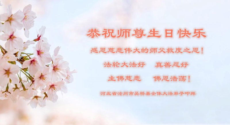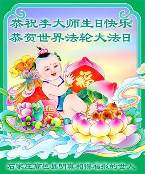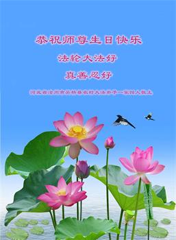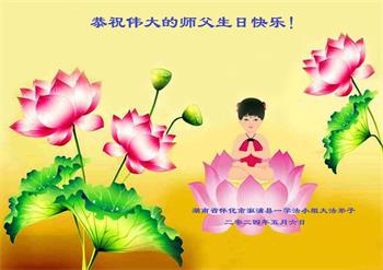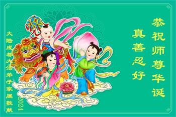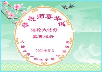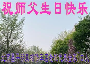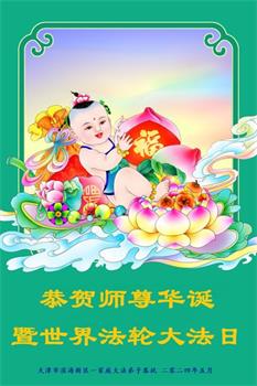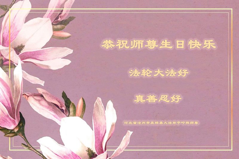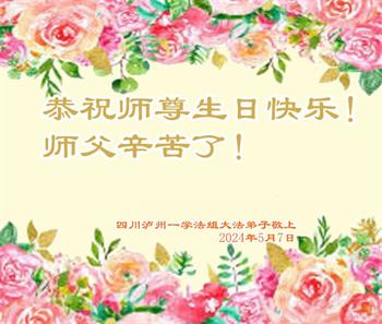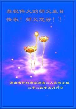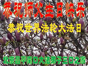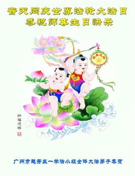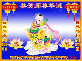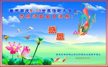 我奶奶爷爷都修炼法轮功。我从小目睹了大法弟子的高尚品德,处处为别人着想的高风亮节。同时也看到了邪党对大法弟子的无端迫害。那时邪党人员经常到家里骚扰,绑架我奶奶,我吓得抱着奶奶的腿大哭,幼小的心灵受到了极大的伤害,从此我恨透了某某党。所以我从上学开始,坚决不申请加入邪党的党、团组织。我虽然还没有走入修炼,但只要遇到困难,我就诚念“法轮大法好,真善忍好”九字真言,就能得到师父的保护,困难很快就迎刃而解。感恩师父的慈悲救度!恭祝师父生日快乐!