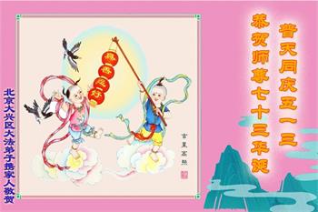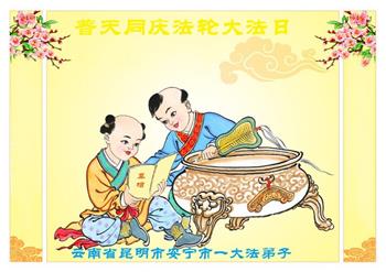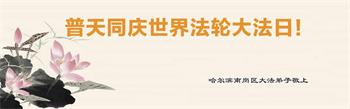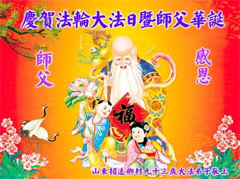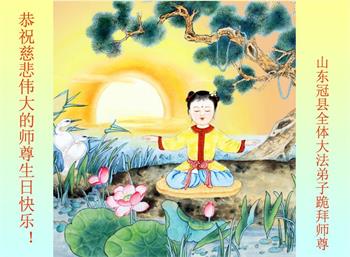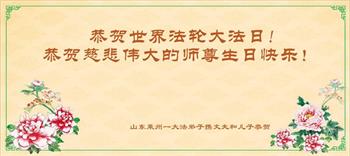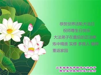 山东省诸城市一青年大法弟子写道:“慈悲伟大的师父好!我九岁时就跟随着妈妈学大法。在邪恶疯狂时期,我和妈妈一起配合发资料、写标语、挂横幅。在妈妈多次被非法关押期间,我没有动摇信念。我非常珍惜师父赐予的‘正法时期大法弟子’的神圣称号。我生逢在师父传宇宙大法时期,万分感谢师父的伟大赐予,这是我生生世世的期盼,这是我来到人世的夙愿。”