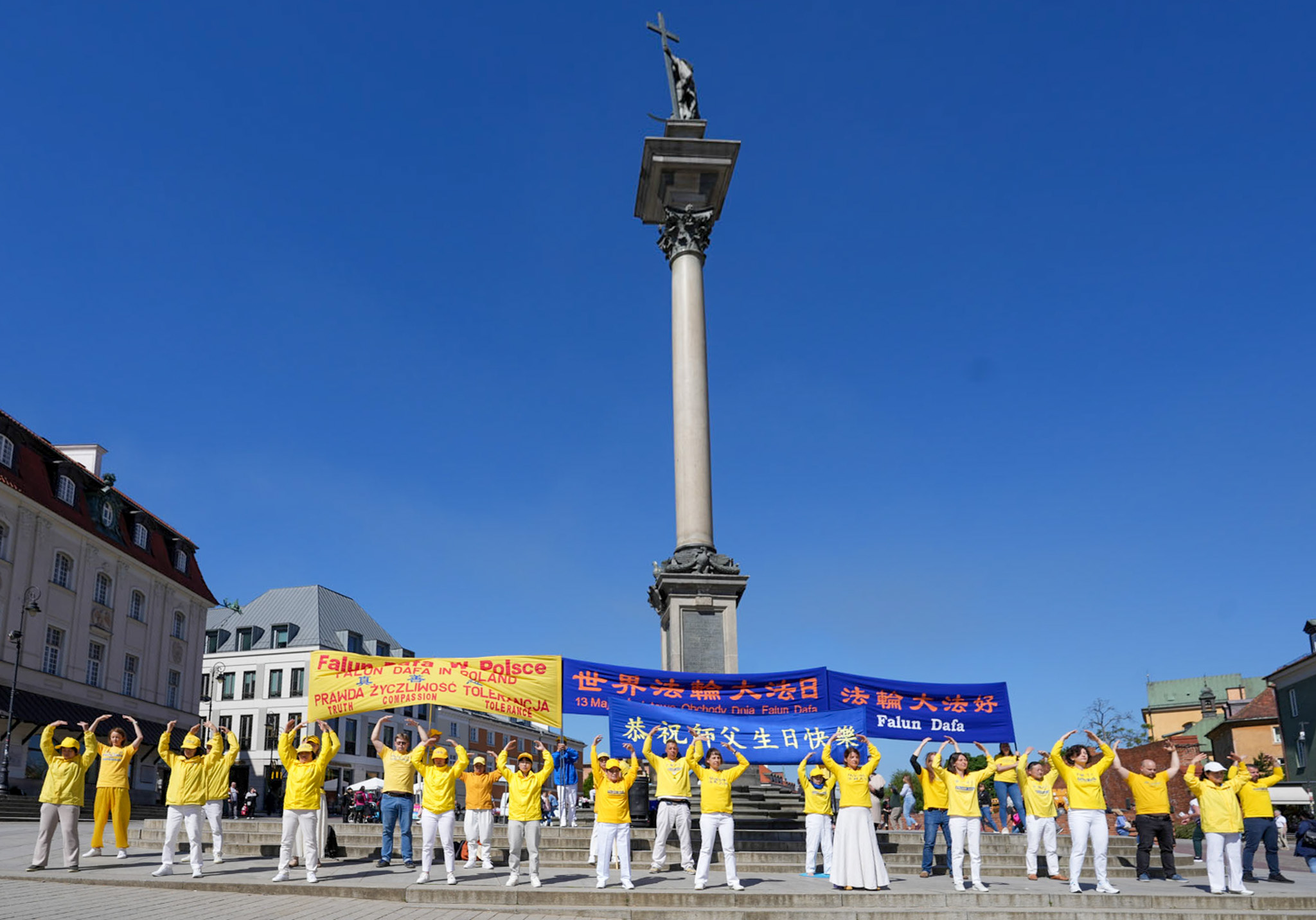 在游行前,法轮功学员集体学法并齐聚华沙古城广场炼功,向慈悲伟大的师尊恭贺华诞。法轮大法是甘甜雨露滋润了多少人干涸的心田,法轮大法是天音圣乐指引了多少人绝地逢生。法轮功学员谢师恩天梯法宝,让每个人一生受益无穷。