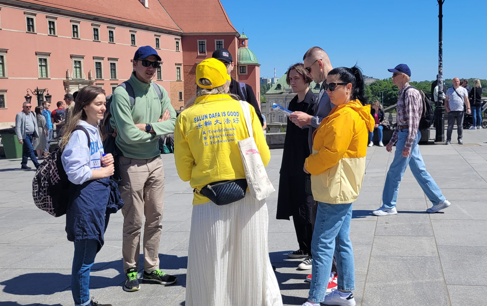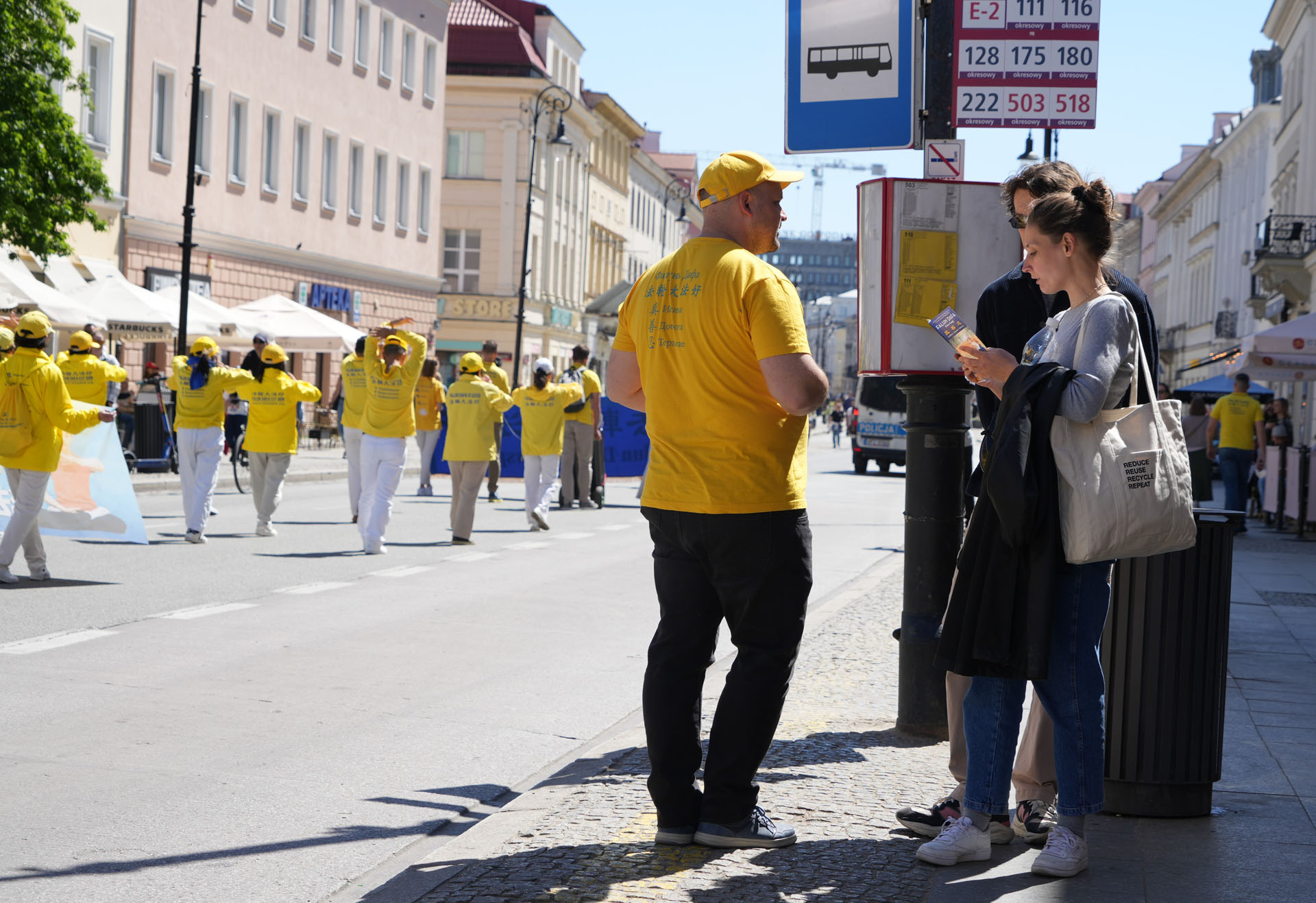 游行队伍在华沙五街口广场结束,一路上法轮功学员不停的向周边路人介绍法轮大法,介绍真善忍,介绍法轮功的真相,介绍法轮功在中国遭受的迫害,也不断有人索要法轮大法传单,有人询问炼功地点时间,也有人询问更多的法轮功真相。