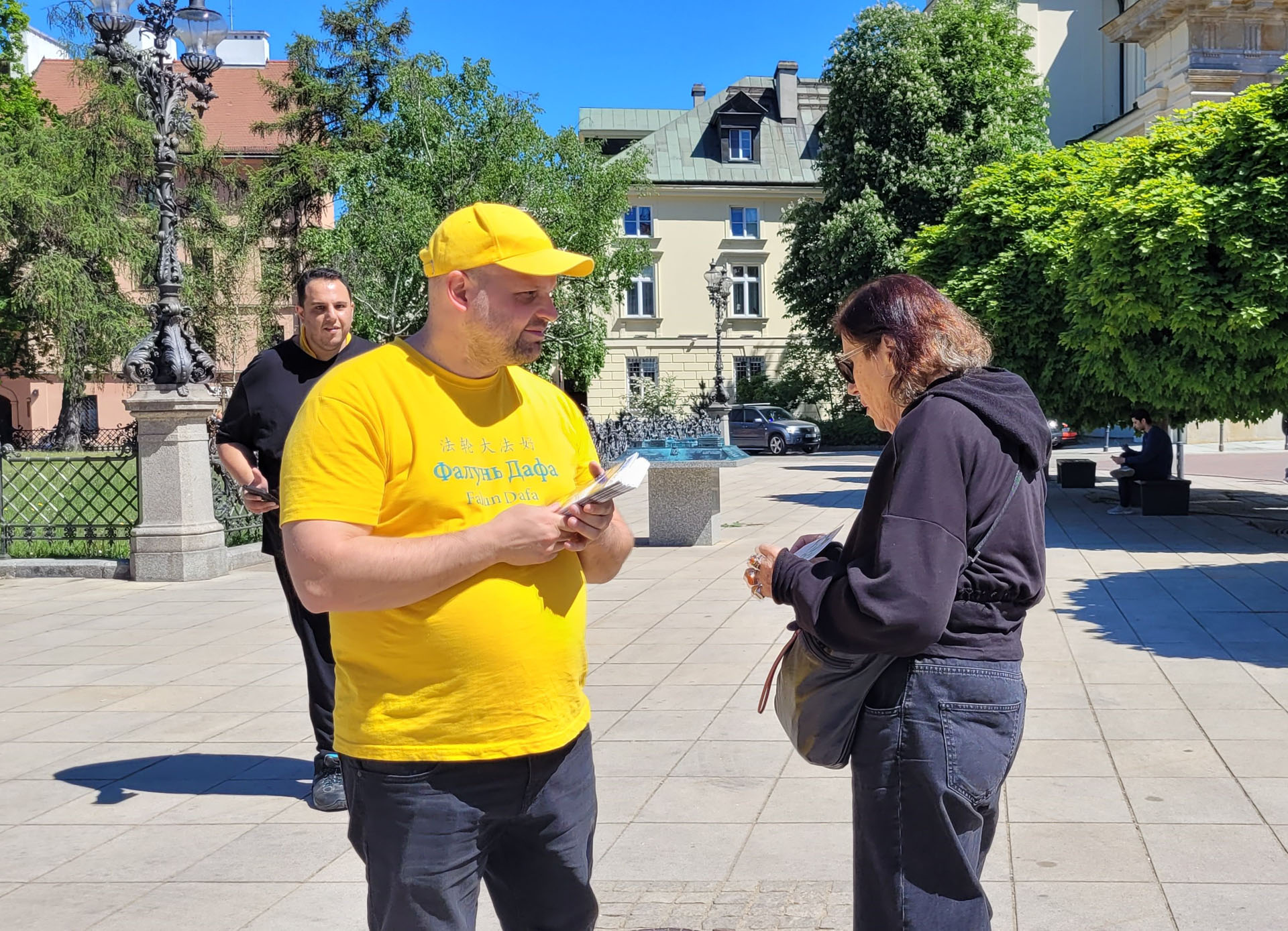 Marta Przybyszewski.女士是一名会计,来自于波兰东北地区一个古老的小城市,在春暖花开的5月来华沙游玩,刚好看见法轮功在古城内的游行,她站在边上观看了很久,索取了一张法轮功真相传单,她说:“我对来自中国传统的健康生活方式非常感兴趣,也渴望亲身尝试和学习”。“我也知道法轮功在中国是被迫害的,而且时间很久了,希望国际社会能联合起来制止这场迫害”,“我非常钦佩法轮功学员的道德勇气,不怕危险,敢于站出来,提高大家的社会意识,祝法轮功好运,加油!”