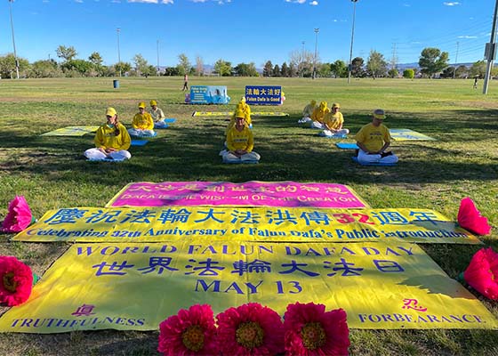 拉斯维加斯部分法轮功学员在沙漠微风公园举办了集体炼功、讲真相征签活动。并以诗朗诵和大合唱的形式来表达弟子们对师尊的无限感恩之情。
