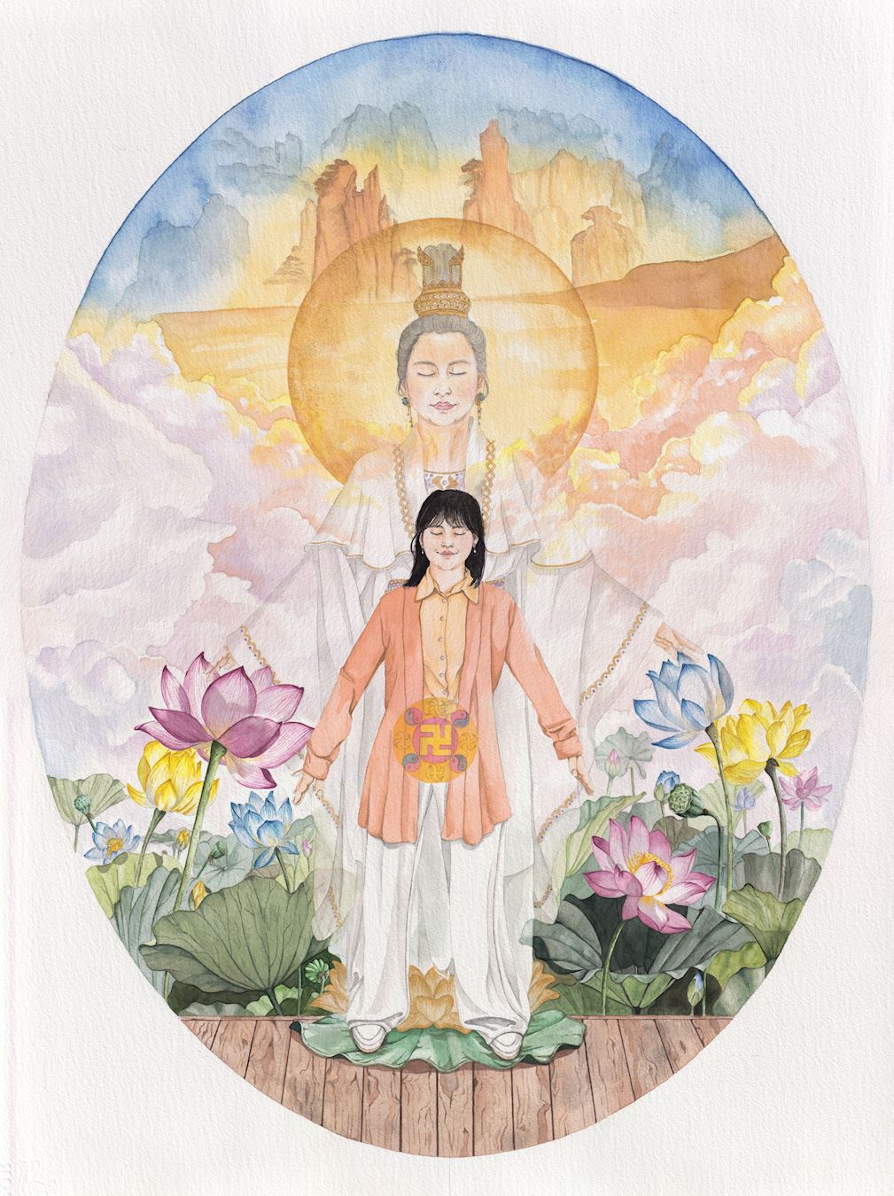 画面是一名法轮功学员正在炼第一套功法(佛展千手法)。背景是她炼功状态在其它空间的展现。