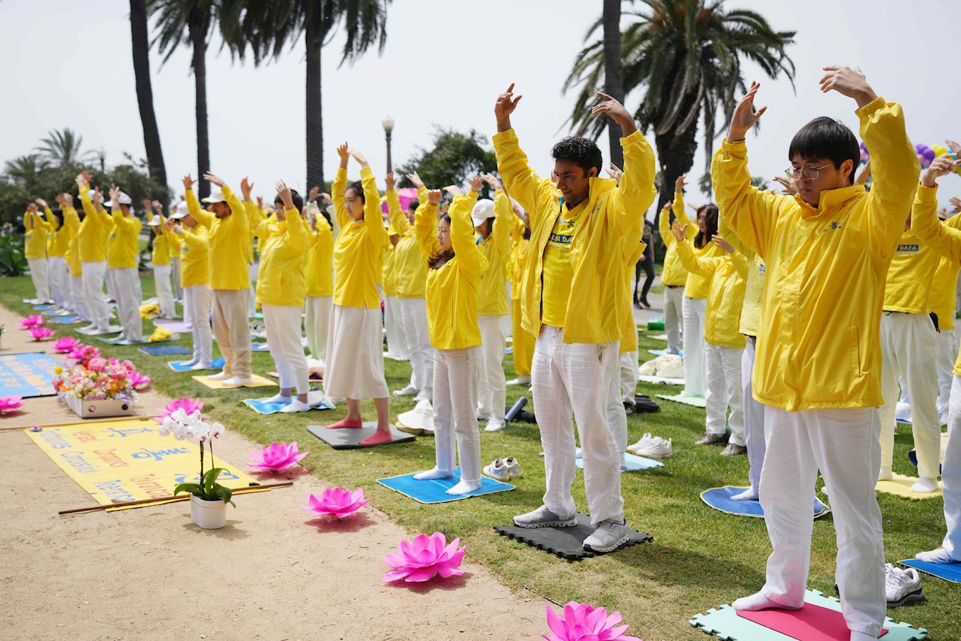 在气侯温暧的清晨,由法轮功学员们组成炼功方阵,伴随着悠扬的炼功音乐,展现法轮大法的美好,埸面祥和壮观。