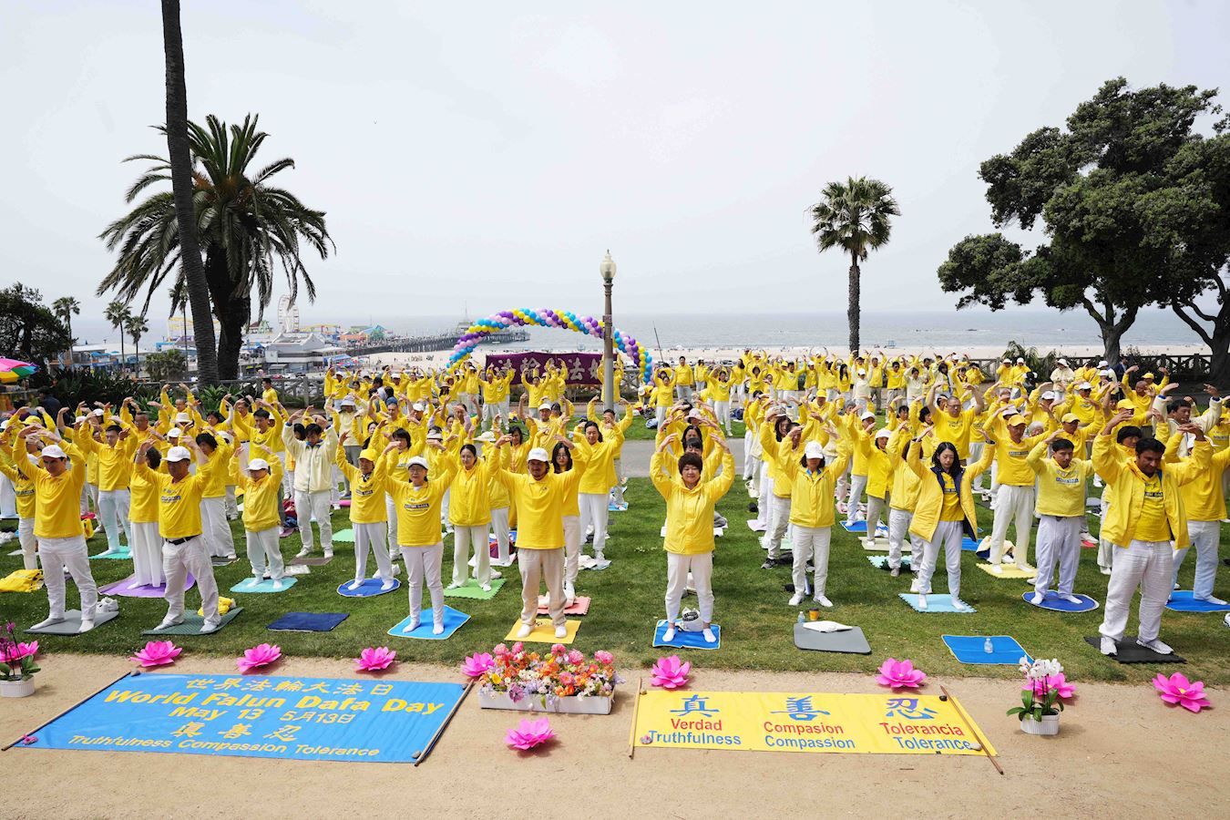 '图1:二零二四年五月十二日,洛杉矶法轮功学员在圣莫妮卡(Santa Monica)海滩举行盛大欢庆活动,并合影恭祝慈悲伟大的师父生日快乐!'