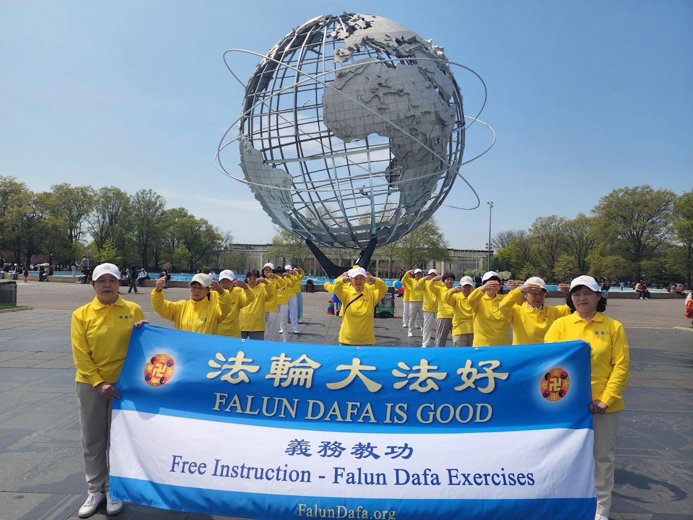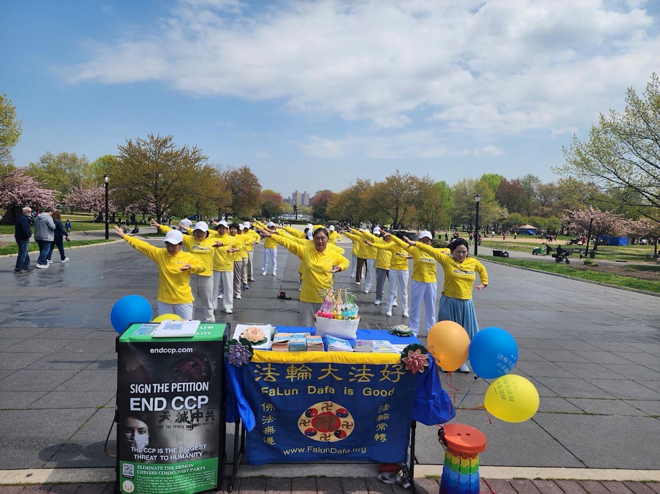 【明慧网二零二四年五月十八日】纽约法拉盛真相点的义工以大炼功、讲真相的形式庆祝第25届世界法轮大法日暨师父华诞。